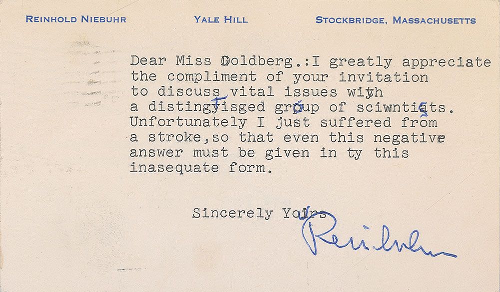 Influential Protestant theologian (1892–1971) and philosopher who reshaped much of American thought concerning society, politics, and the meaning of history. TLS signed “Reinhold,” one page, 5.5 x 3.25, personal letterhead, August 29, 1964. Letter to a Metromedia representative. In full: “I greatly appreciate the compliment of your invitation to discuss vital issues with a distinguished group of scientists. Unfortunately I just suffered from a stroke, so that even this negative answer must be given to you in this inadequate form.” Several typographic errors have been hand-corrected. In fine condition, with a couple light creases and some show-through from postmark ink.