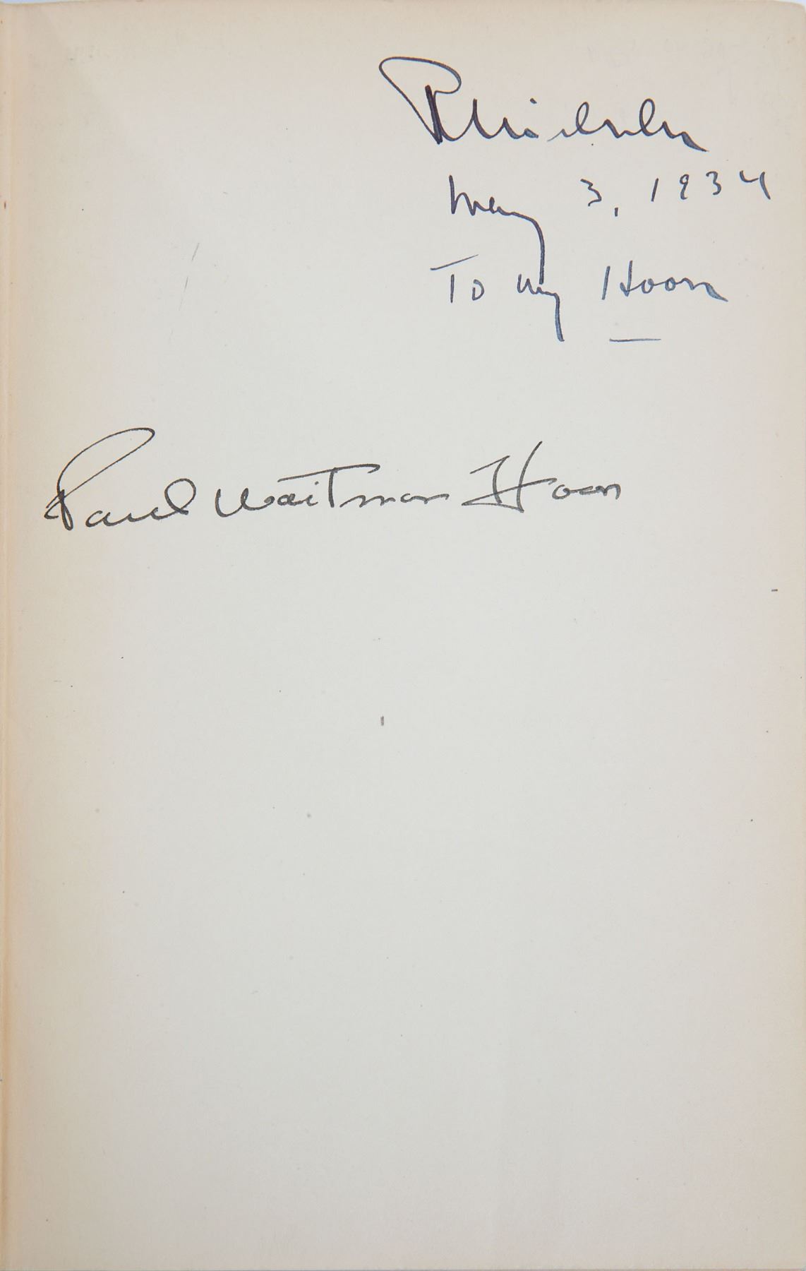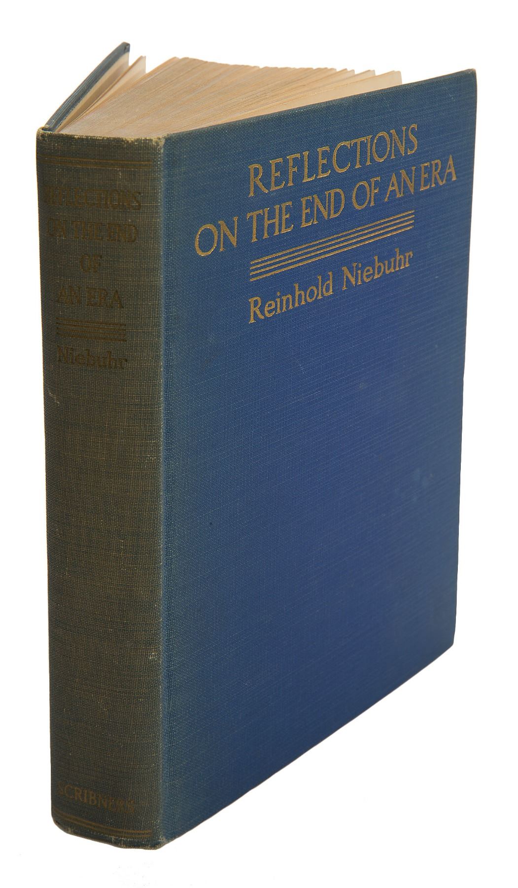 Protestant theologian and philosopher (1892-1971) who reshaped much of American thought concerning society, politics, and the meaning of history. Signed book: Reflections on the End of an Era. First edition. NY: Charles Scribner's Sons, 1934. Hardcover, 5.75 x 8.25, 302 pages. Signed and inscribed on the first free end page in fountain pen, "R. Niebuhr, May 3, 1934, To my Hoon." In fine condition, with sunning to the spine and an ownership signature beneath Niebuhr's.