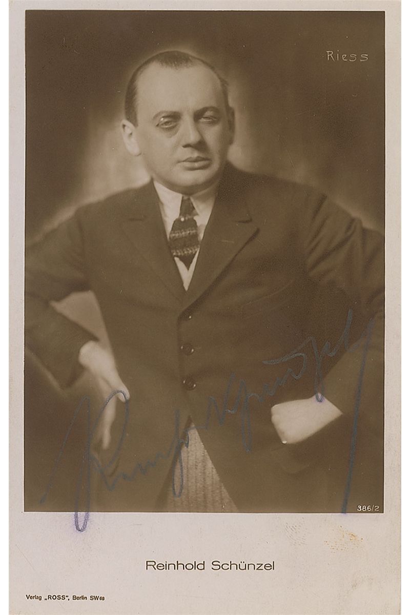 Actor and director born in Germany, who the Nazis allowed to continue making films despite his Jewish heritage (1886–1954). Vintage 3.25 x 5.25 postcard photo by Ross of Berlin, signed in pencil. Light scattered soiling, trivial silvering to dark areas of the image, and some light contrast to areas of the signature, otherwise fine condition.