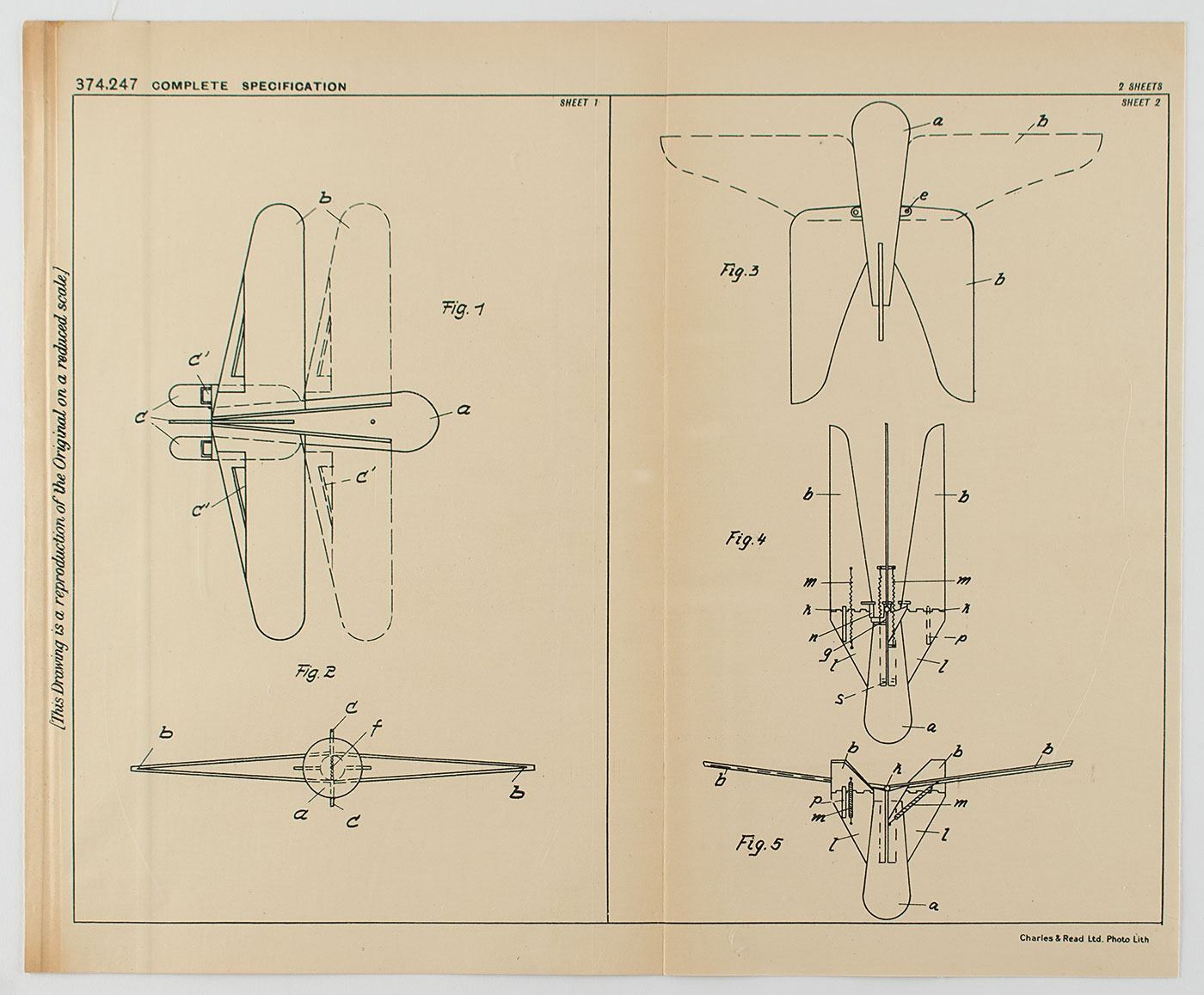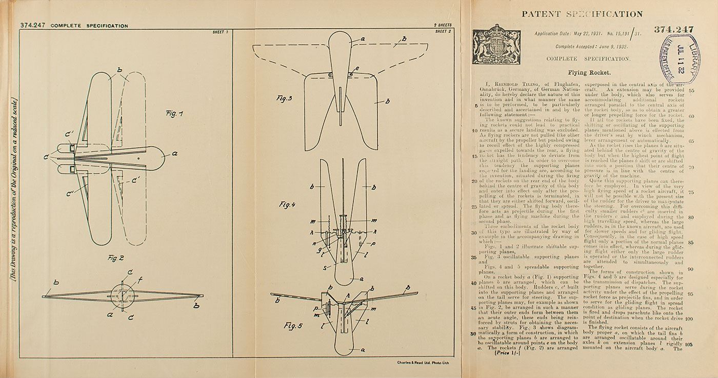 Original linen-backed patent lithograph for Reinhold Tiling's invention of a flying rocket, one page, 12.5 x 10.5, June 9, 1932. The diagram depicts a flying rocket with folding and moveable fins for different stages of flight, to allow gliding, steering, and swinging out like a parachute for safely landing. Includes the printed British "Patent Specification" document, two pages on one sheet, which describes the invention. The specification sheet bears a "U.S. Patent Office Library" ink stamp on the first page. In fine condition. Reinhold Tiling was a German engineer, pilot, and rocket pioneer (1893–1933) who was killed as a result of burns suffered in an explosion at his rocket workshop. In 1931, his demonstration that 188 postcards could be carried reliably on a rocket made his projects famous and drew widespread public interest.