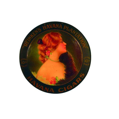Reinkens Havana Plantation Cigars Self Framed Tin Sign, light scratch across her neck otherwise excellent condition, 14 inch diameter.