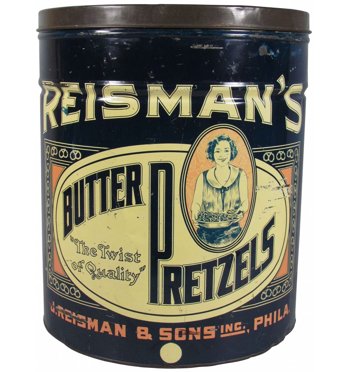 Reisman's Butter Pretzels Store Tin. Scratches and rubs otherwise good condition. 12 inch diameter X 14 1/2 inches tall.