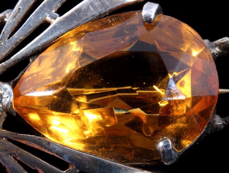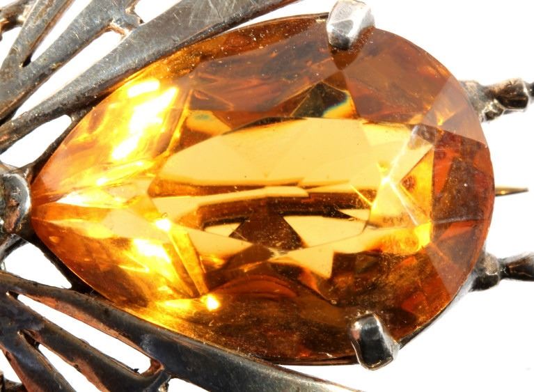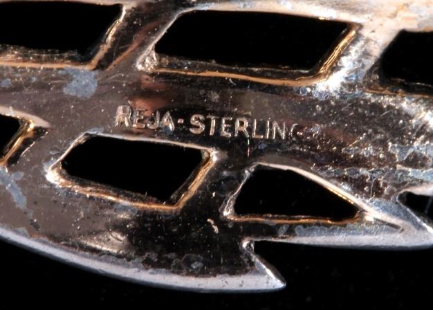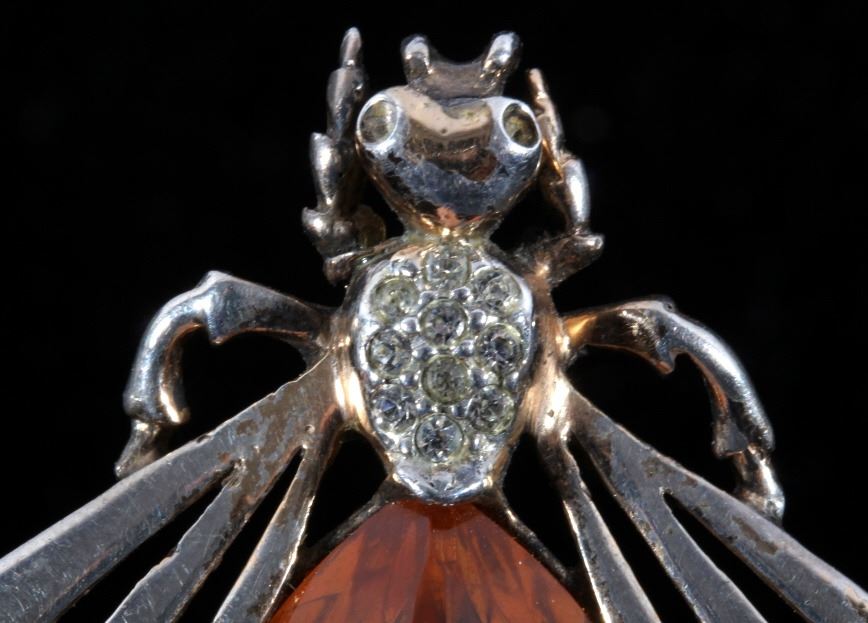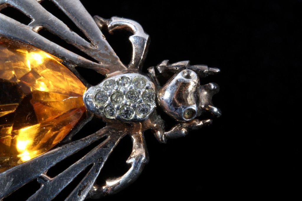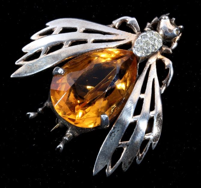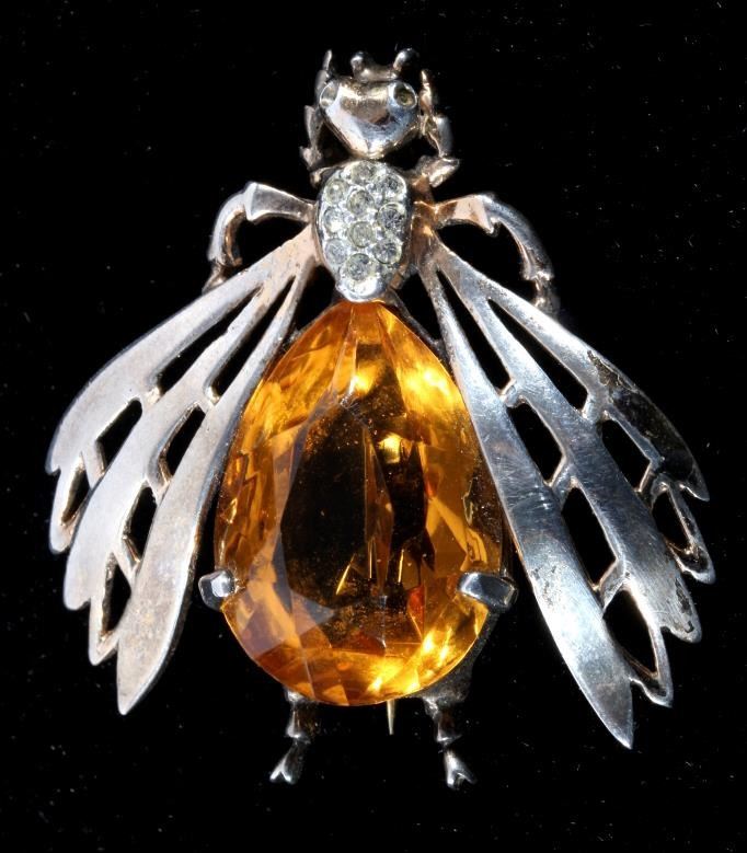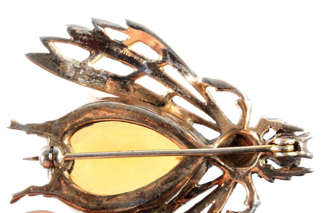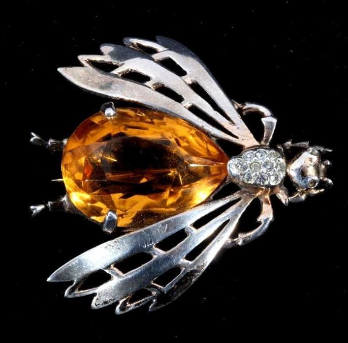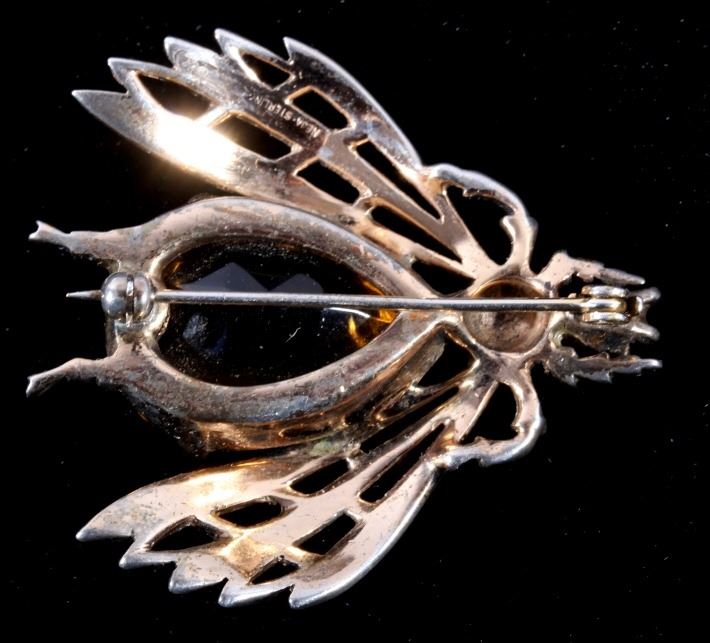 This is a Reja Sterling Silver with a Rose Gold wash pin or brooch with a wonderful Art Deco design. The piece is from the 1930-1940's and shows good condition. The pin shows exquisite craftsmanship and a wonderful faceted Citrine stone representing the insects body. The back is hallmarked "REJA STERLING". Stones not tested. Piece measures 1 7/8"x1.75".