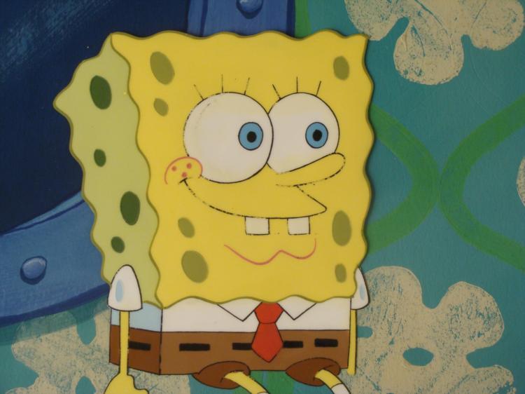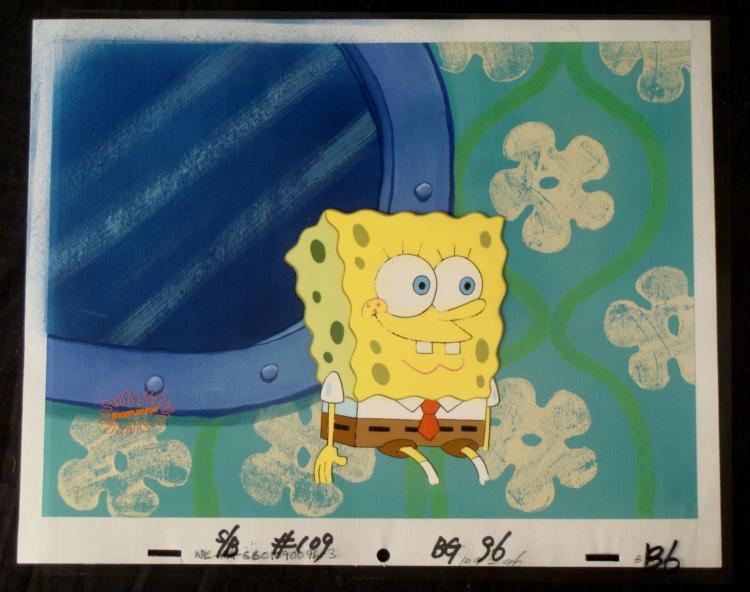 This original hand-painted background and animation cel are from the Nickelodeon TV show SpongeBob Squarepants. The story takes place under the deep blue sea in Bikini Bottom, where SpongeBob resides. SpongeBob, who is a yellow, porous sponge, is your typical happy-go-lucky character, as he is always cheerful and enjoys making people laugh. Patrick Star, SpongeBob's neighbor who is a starfish, is your average children's show idiot, as he boasts knowing nothing and is often getting himself into ridiculous situations. Between the homes of these two lies the home of the miserable Squidward, a squid, who is known for being grouchy and playing tricks on SpongeBob and Patrick. Both SpongeBob and Squidward work at the Krusty Krab, a fast food business run by the greedy money-loving Mr. Krabs, a crab, the arch rival of the evil, possibly misunderstood, Plankton. Another neighbor, Sandy Cheeks, an athletic squirrel who normally wears an astronaut's space suit, was introduced in "Tea at the Treedome." She spends most of her time inventing and experimenting. * SpongeBob is sitting in his house. * Original Production Background and Animated Cel Overall Size of Background: 10" x 13" Overall Size of the Cel: 10 1/2" x 12 1/2" Very good condition This is an original hand-painted cel set-up used in the production of an episode of "SpongeBob SquarePants." Each one-of-a-kind set-up represents a slight change in position of the characters. When individually photographed and projected in rapid succession, the images appear to move. * To create production cels, the original animator's drawing is transferred onto an acetate cel (by hand-inking and/or photo copying). The cel is then hand-painted on the reverse side. The background accompanying this set-up is a hand-painted original production background. * The background is ready to be matted and framed. It is a colored background with a cel and has the animator's notations at the bottom of the background and the cel. There is a Nickelodeon TV logo on the bottom left of the cel. There is some slight paint fade to SpongeBob's outline. *
