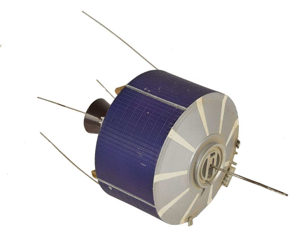 Vintage model of a relay satellite, measuring an overall 7.5? tall with a diameter of 3.5?. In fine condition.