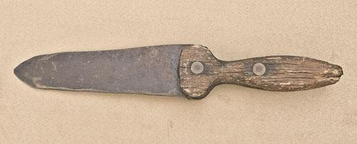 Relic condition dag-type knife with thin trade-steel type blade, 12” overall, blade approx. 7” by 1-7/8” at widest point. Blade secured by plain brass rivets in wood grip. Grip is weathered and fragmentary fromexposure. Blade is rusted and worn and shows sharpening at the edges, reduction from use, and light to heavy pitting. These are among the earliest knives identified to American Indians, and this one, although in reliccondition, is authentic. Est: $800 - $1,600