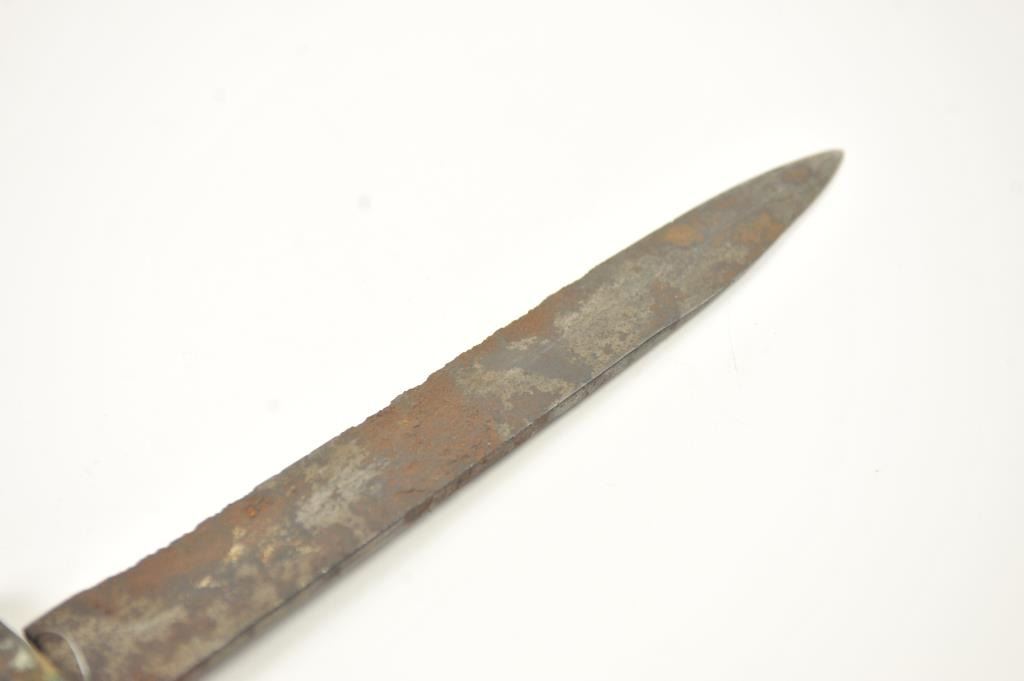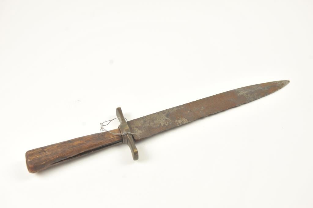 Relic condition original Rifleman’s knife with the hilt and grip altered during use. No blade marks with “W.D.” on the guard. A very cool U.S. issue and frontier re-tasked knife or Bowie. Est.: $500-$1,000.