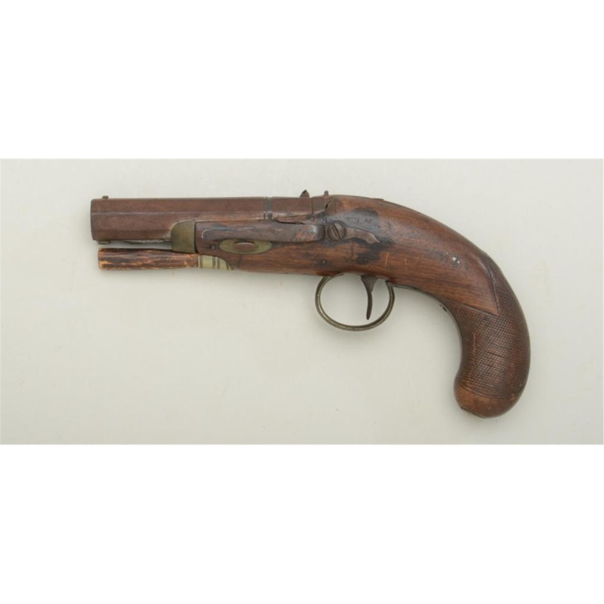 Relic condition percussion single shot pistol, .45 caliber, 3-1/2” octagon barrel, checkered wood stock, wood ramrod, German silver trigger guard. This gun is uncleaned , missing its hammer and a section of wood onthe right side of the top strap; belt hook still present; would look great in a display case or wall mount. Est.: $50-$100.