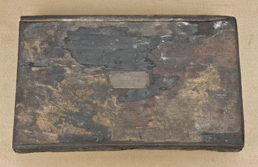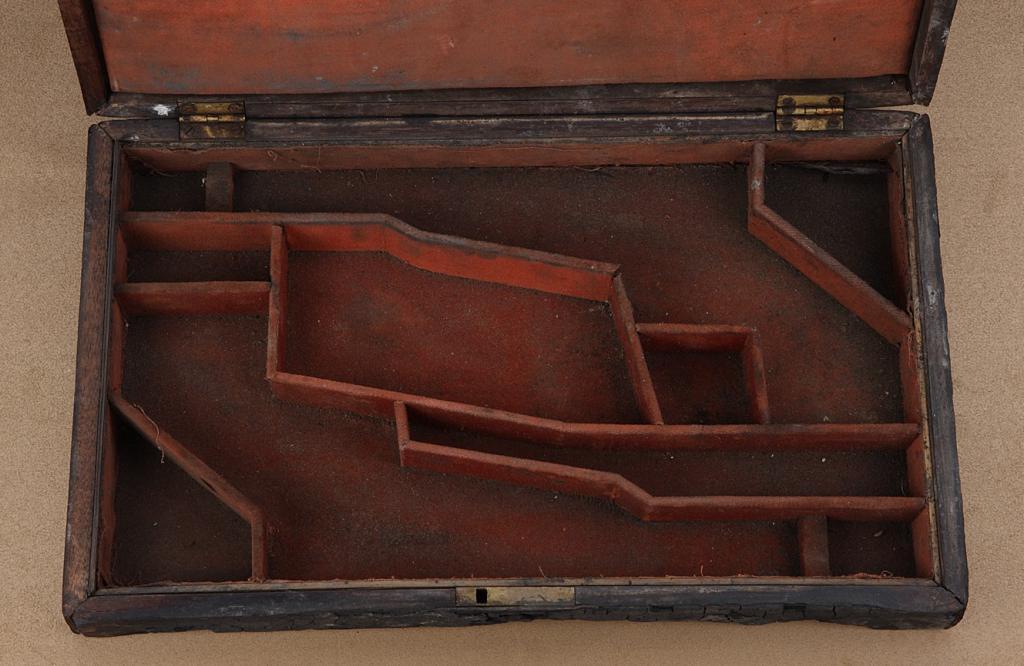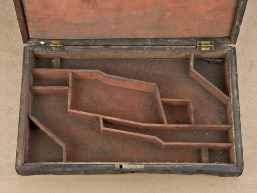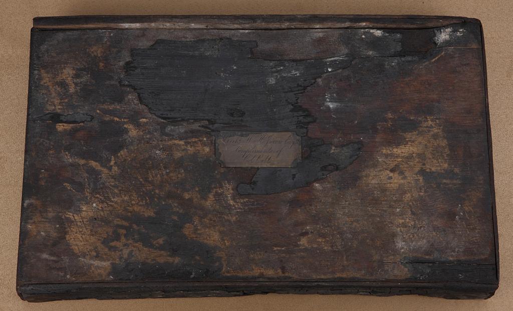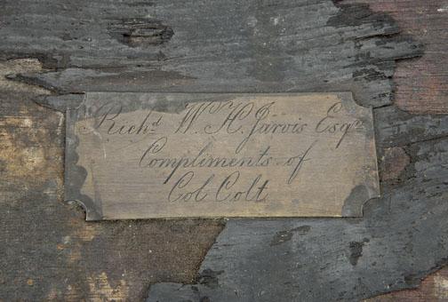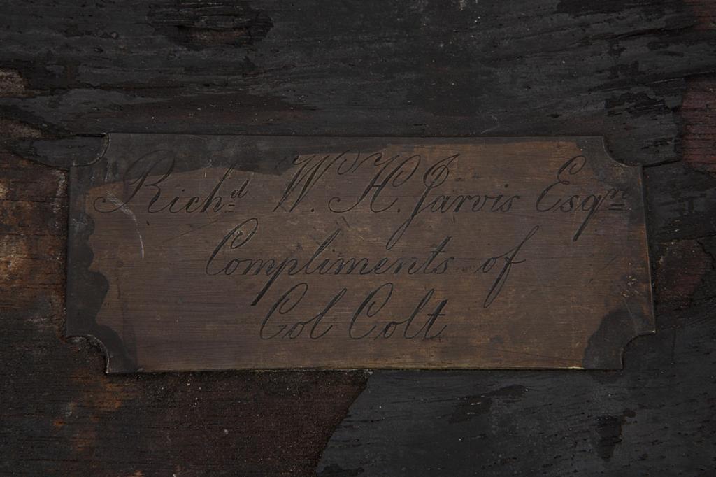 Relic condition presentation case for pair of 1860 Army Colts, lid inlaid with original inscribed plaque that reads “Rich’d W. H. Jarvis, Esq. Complements of Col. Colt”. The exterior of the case has been badly burned.The veneer is near charred. The plaque is darkened but very legible. The interior of the case has survived remarkably well due to the air seal which protected it. The partitions are intact and the material issomewhat darkened but fair to good. The left top corner of the box is missing, and the top is slightly warped. An interesting relic in the fact that Jarvis was one of the most important people associated with Colt and was his brother-in-law and President of the Colt firm. Est: $1,500 - $3,000