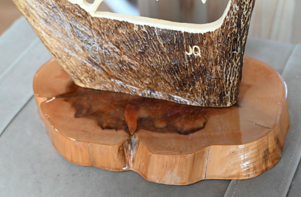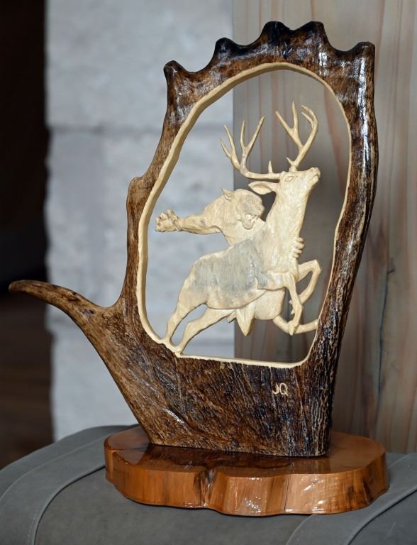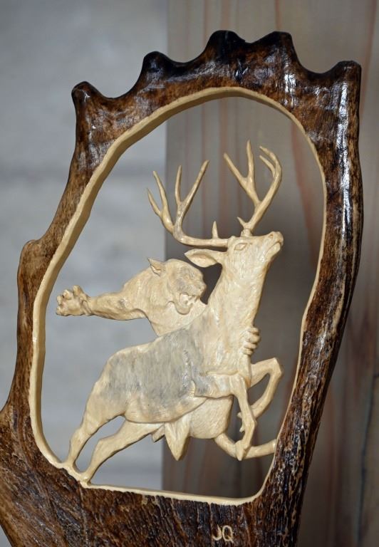 Scene of panther attacking deer. Signed by artist "JQ". Measures 14" x 15", mounted to lacquered wood base.