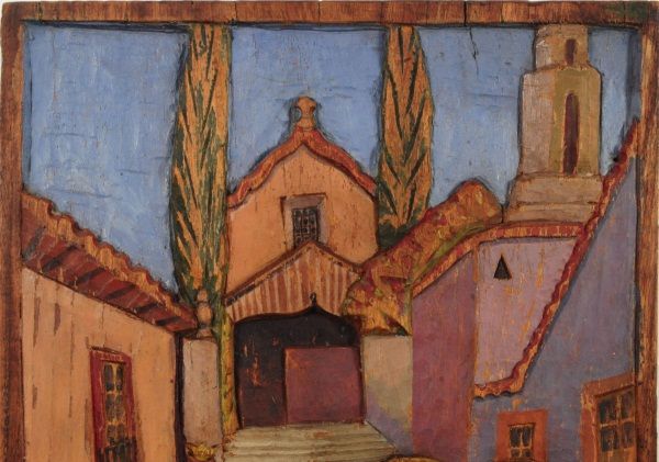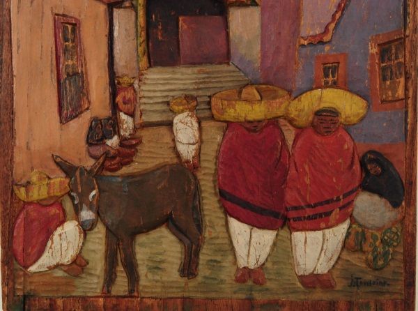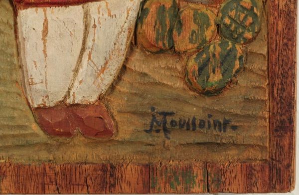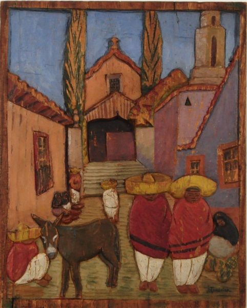 Village street scene, signed "Toussaint" on lower RH corner. 13" x 16-1/4".
