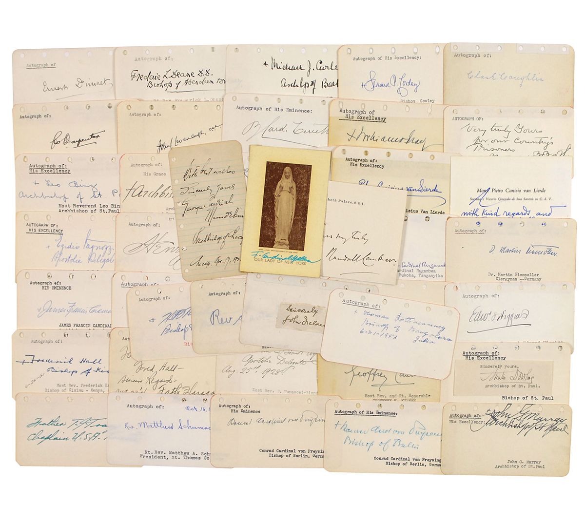 Collection of approximately 37 ink signatures of numerous religious figures, primarily on individual off-white 4.5 x 2.5 pages, some lined. Signers are: Patriarch Athenagoras, Leo Binz, Maud B. Booth, William O. Brady, George L. Carpenter, John Cavanaugh, Bonaventura Cerretti, Charles Coughlin, Leonard Philip Cowley, Michael J. Curley, Frederick L. Deane, Ernest Dimnet, Austin Dowling, Father E. J. Flanagan, Geoffrey F. Fosher, P. Fumasoni-Biondi, Hilary Baumann Hacker, Frederick Hall, Edward Higgins, Frank Cardinal Koenig, Peter Canisus van Lierde, Jacob Mangers, M. Gerard McGinley, James Francis Cardinal McIntyre, George Cardinal Mundelein, John G. Murray, Martin Niemoeller, Thomas Pothacamury, Conrad Cardinal von Preysing (2), Laurian Cardinal Rugambwa, Matthew A. Schumacher, Fulton J. Sheen, Henry J. Soltau, F. Cardinal Spellman, Edigio Vagnozzi, and Wilbur Glenn Voliva. In overall fine condition, with light edge toning.