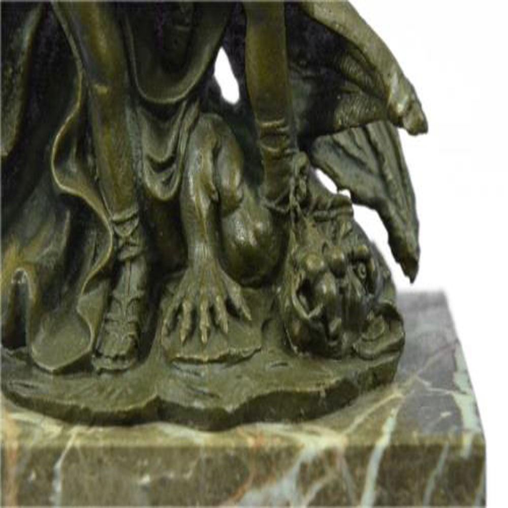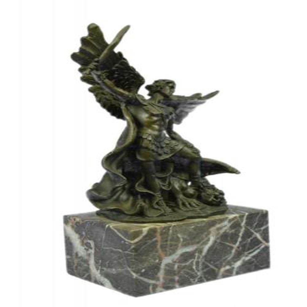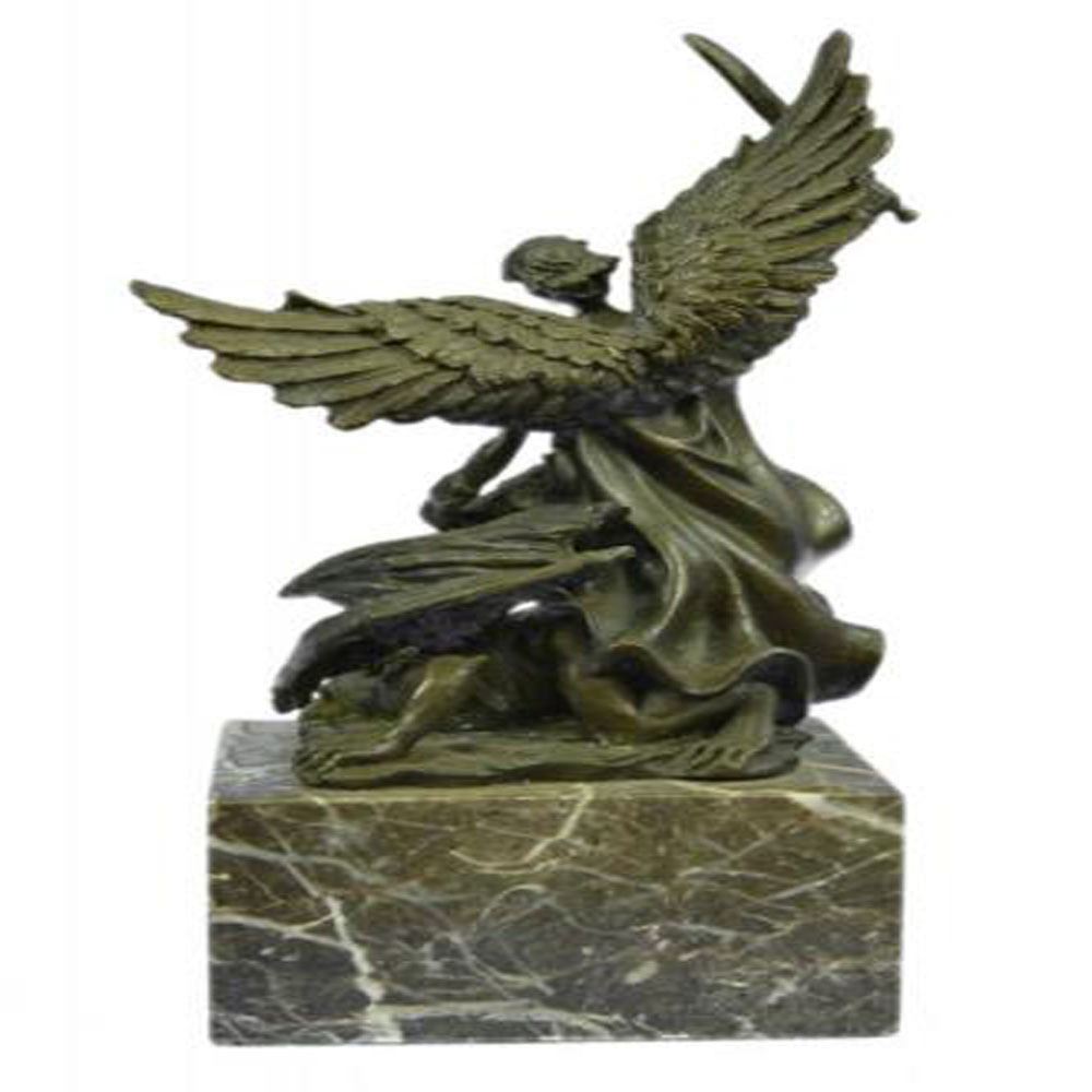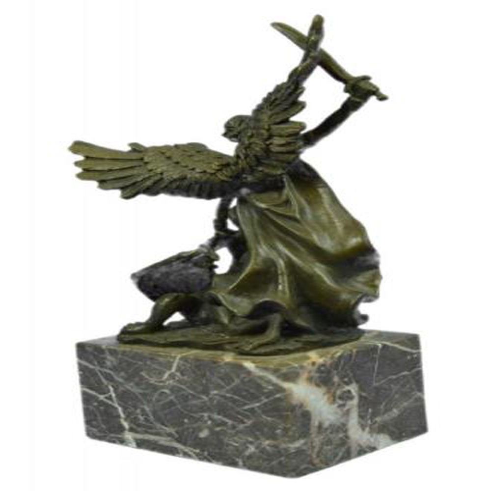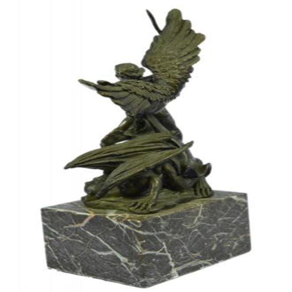 This is a bronze sculpture featuring St. Michael slaying Lucifer. Religious legends says in the Book of Revelations that Michael, one of the mightiest of the angels, when war waged in the heavens, commanded angels under him to fight against Satan and his angels. Lucifer lost the battle and was forced out of heaven. The sculpture captures St. Michael in his holy might smiting the horned evil under his heavy foot. The details and craftsmanship are remarkable throughout the sculpture transforming a hard metal into an natural lifelike vitality. The handmade sculpture was molded using the ancient method of lost wax casting and stained with a brown patina finish for preservation and is mounted upon a marble base. Bronze Dimensions with Marble Base: Height 8 X Width 5 Inches. Weight: 5 LBS.
