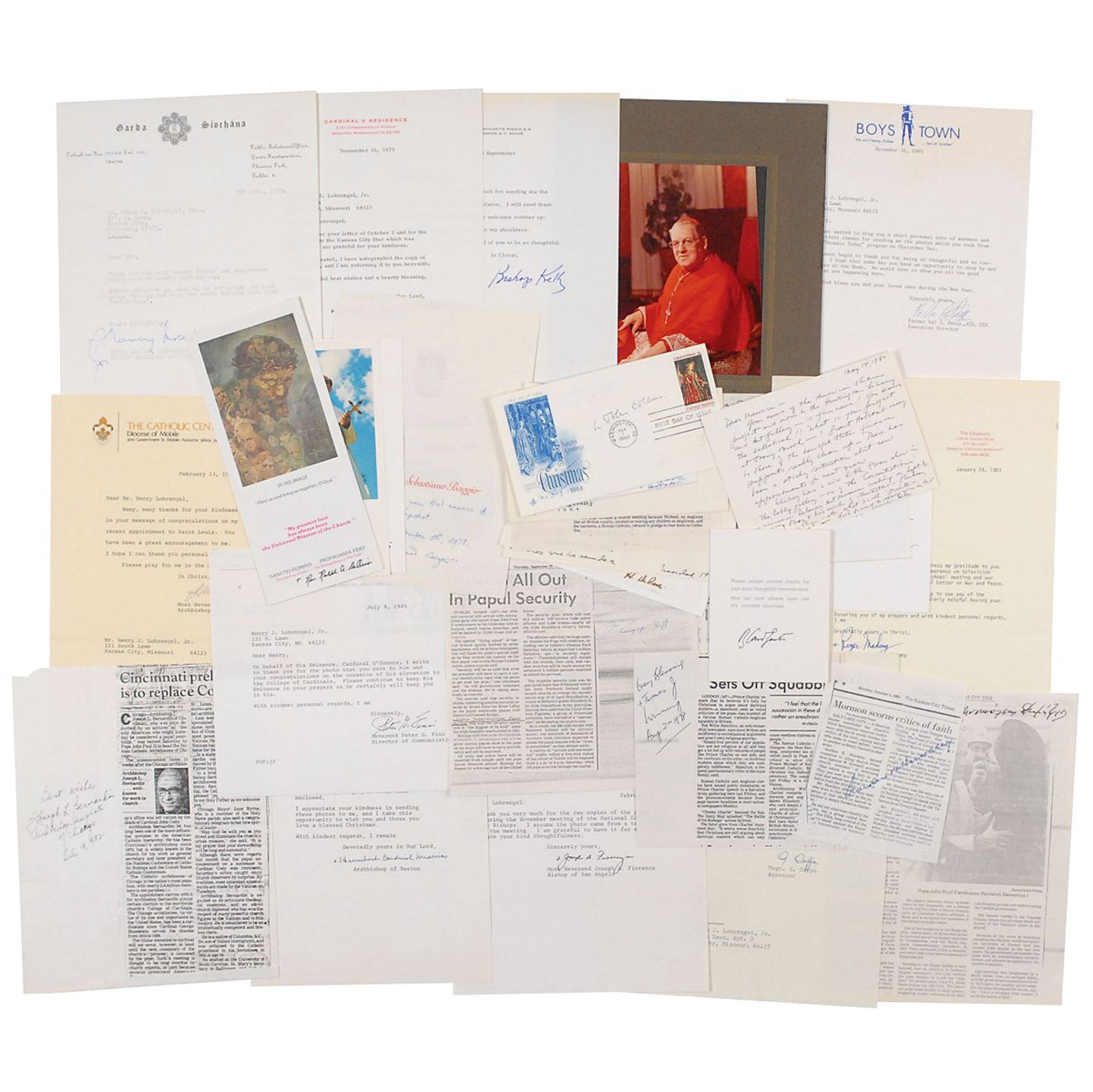 Collection of approximately 30 items, comprised of letters, souvenir typescripts, signatures, and photos, each signed by a religious leader, including: John Cardinal Cody, Sebastiano Baggio, Giovanni Benelli, Reverend Peter Finn, and Reverend Joseph A. Fiorenza. In overall very good to fine condition.