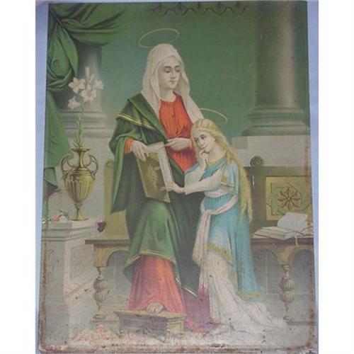 An early 20th century religious lithograph on tin, 23 1/2" X 17 1/2". Scene of a mother teaching her child to read. Unsigned the tin has some light rust at the bottom as shown. An early 20th century piece of religious art that was once framed and hung in a church, convent or school.