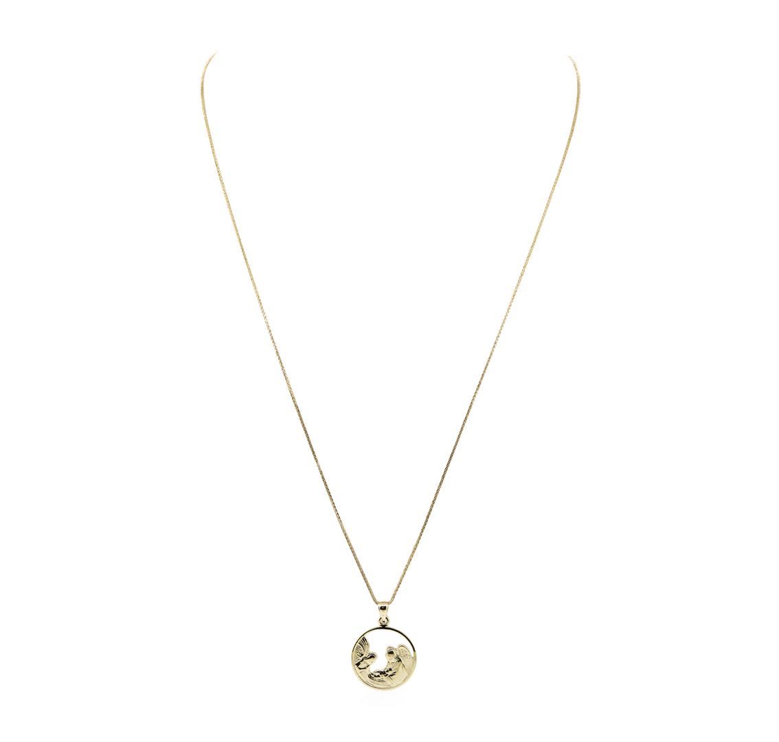 One religious theme pendant with an attached 24 inch long, 1mm wheat link chain featuring: 14KT yellow gold weighing 7.4 grams.