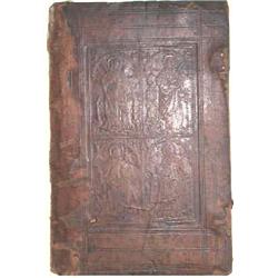 Reliure, France Plats d'une reliure parisienne à plaques. Paris, début 16e s. Reliure monogrammée et signée Pierre Gipot : veau estampé à froid sur ais de bois, grandes plaques serties de filets : 260 x 170 mm (plats frottés, bords en partie dénudés, traces de fermoirs et de renforcements aux mors, petits manques, qqs incisions sur le plat sup.). La plaque du premier plat (162 x 102 mm) est divisée en 4 compartiments soit : saint Jean l'Evangéliste, sainte Barbe, sainte Catherine et saint Nicolas, chacun sous une archivolte avec fond étoilé; avec dans le compartiment inf. dr. l'intitale "P" et dans celui de g. "G" pour Pierre Gipot. Au second plat, une plaque (166 x 122 mm) à bordure de pampres, fleurs, oiseaux, dragons et banderoles contournant un champ rectangulaire composé de 5 roulettes verticales (fleurs et pampres). Les banderoles contiennent les devises "esperence" "en" "dieu tout" "bon" "advis " ainsi que le nom du relieur "Pierre Gipot " mais cette banderole est assez effacée (i.e. Gigot ou Guiot ou Ginot ?).Rare spécimen d'une reliure signée attestée sur des éditions parisiennes de 1501 à 1510. # Goldschmidt, Gothic and Renaissance bookbindings, cat. n° 55, pl. 22-23 (même plaque, en bon état mais avec le nom également difficilement lisible); # manque à Weale.Provenances : annotations anciennes en latin sur les ais; le Chne. L. Bellefroid (étiq.); Dubois d'Enghien (cachet). 150 Euros