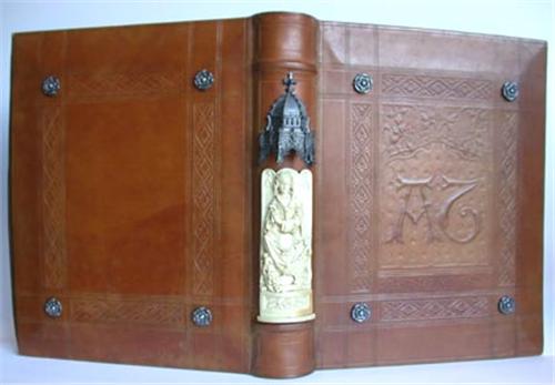 Reliure moderne au dos orné d'une ronde-bosse en ivoire et d'un dais ciselé en argent. In-f°. Chemise en plein veau naturel sur ais de bois, plats dans le style des reliures du moyen âge avec grande roulette à froid cernant des motifs végétaux et monogramme A.T. gaufré à froid, 4 écoinçons d'argent aux angles, plaque d'ivoire ciselée sur le dos (sainte médiévale terrassant un dragon, 175 x 70 cm) surmontée d'un dais en argent ciselé (110 x 80 mm), tranches et rabats et couvrure intérieure en soie moirée brun foncé.