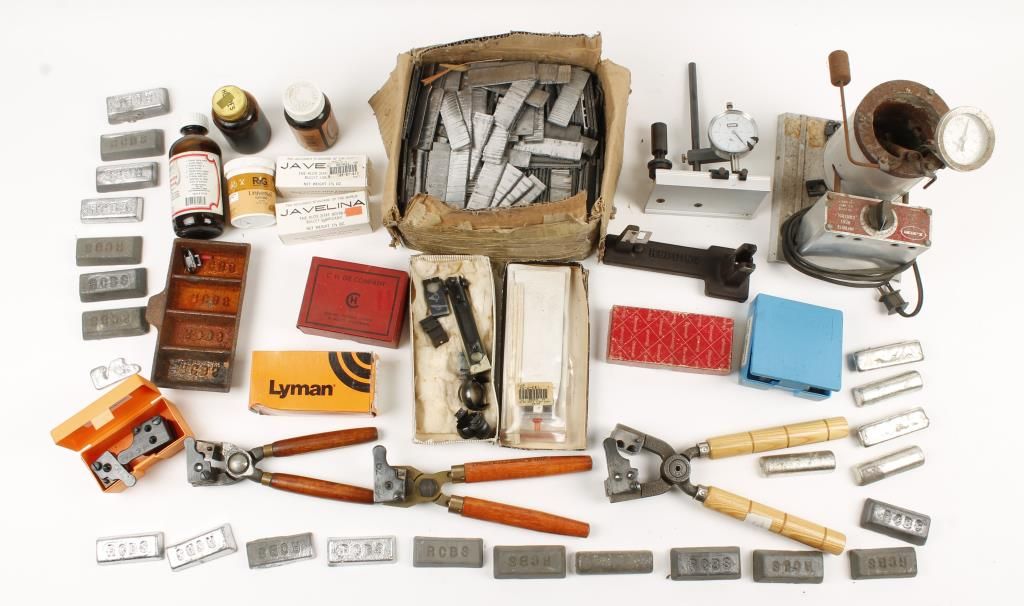 Melting pot, 50+ pounds of lead, molds, a Casemaster, assorted chemicals, scale, primer brushes, and micrometer.
