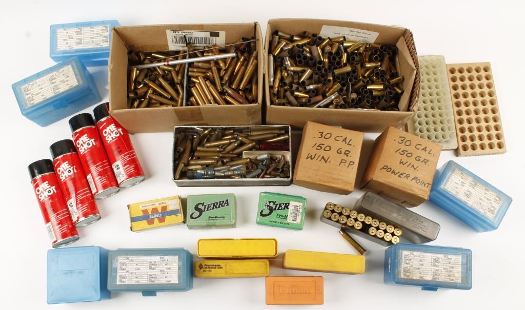 Approx. 500 shells various caliber's. 22 empty loading boxes. 200 30cal bullets. 100 7mm bullets. 4 cans of case lube.
