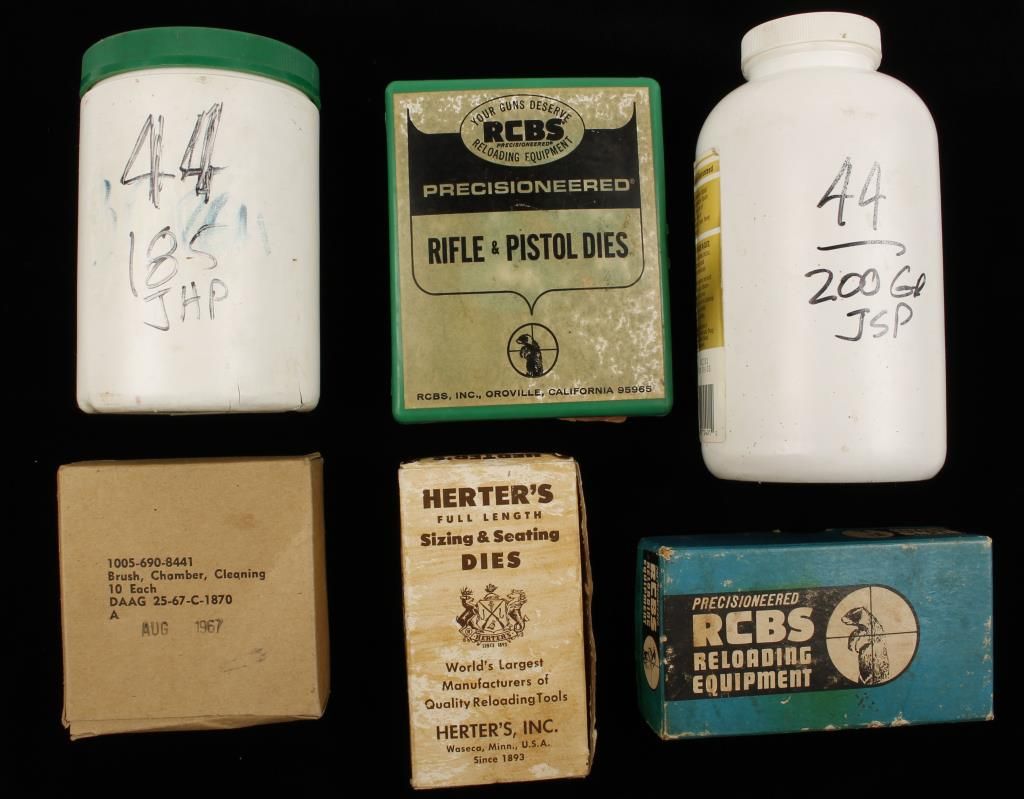 Cal. 44 200 gr JSP( approx 150) and Cal .44 185 gr JHP bullets (approx 300). RCBS 22-250 die set in original box. RCBS 30-06 FL resizer. Herters 6mm Remington 2 piece die set. Eight. M1Garand chamber brushes.