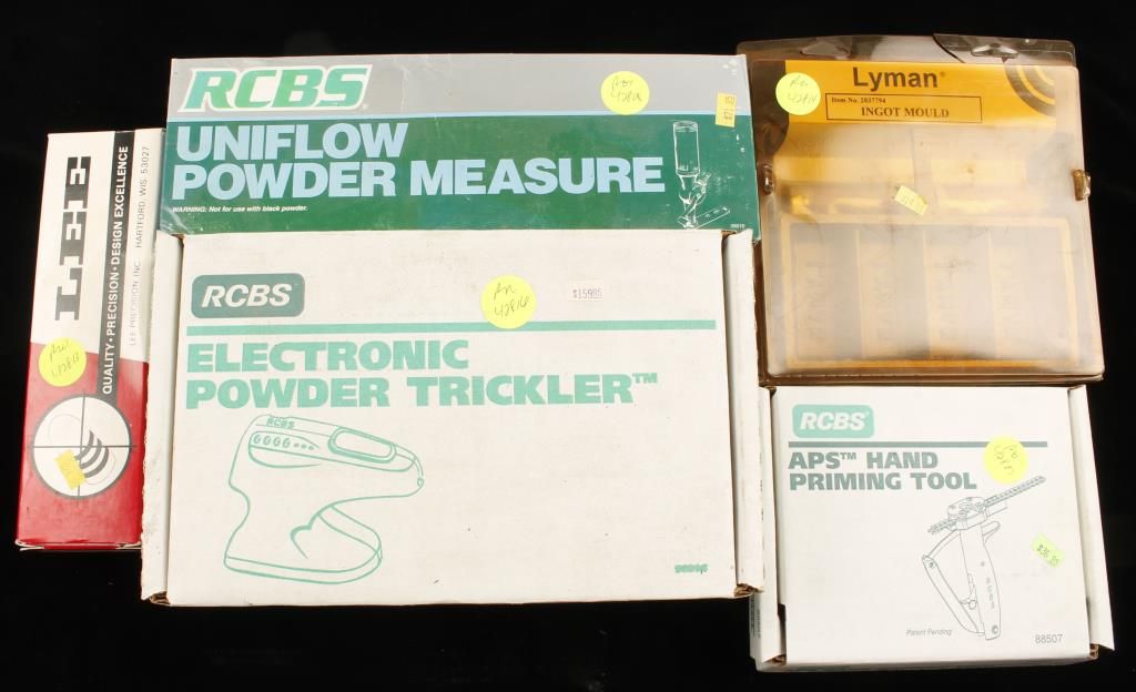 RCBS Electronic Powder Trickler, Uniflow Powder Measure, APS Hand Priming Tool, Lyman Ingot Mould and a Lee Bullet Mold for a .578/478 gr. All in original boxes.
