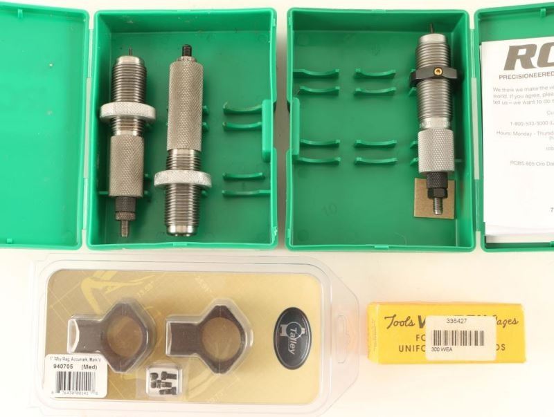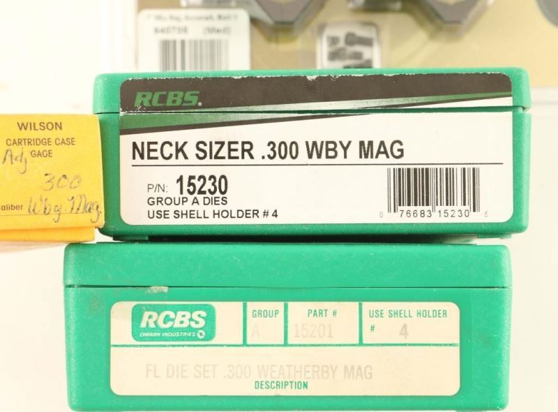 Including; RCBS Neck Sizer for 300 Wby Mag, RCBS FL Die Set for 300 Wby Mag, Wilson Cartridge Adj Gage for 300 Wby Mag and a set of scope mounts.