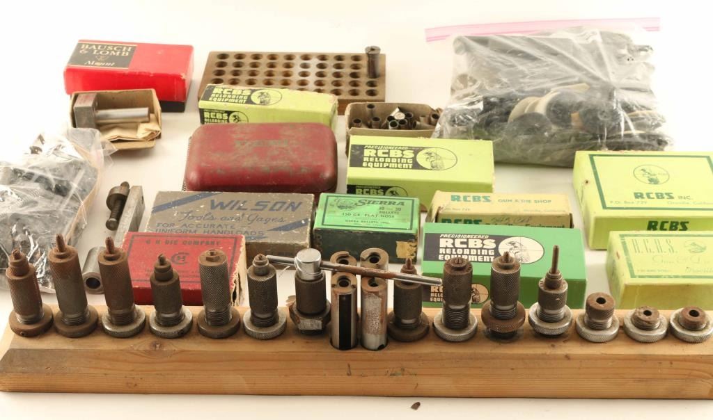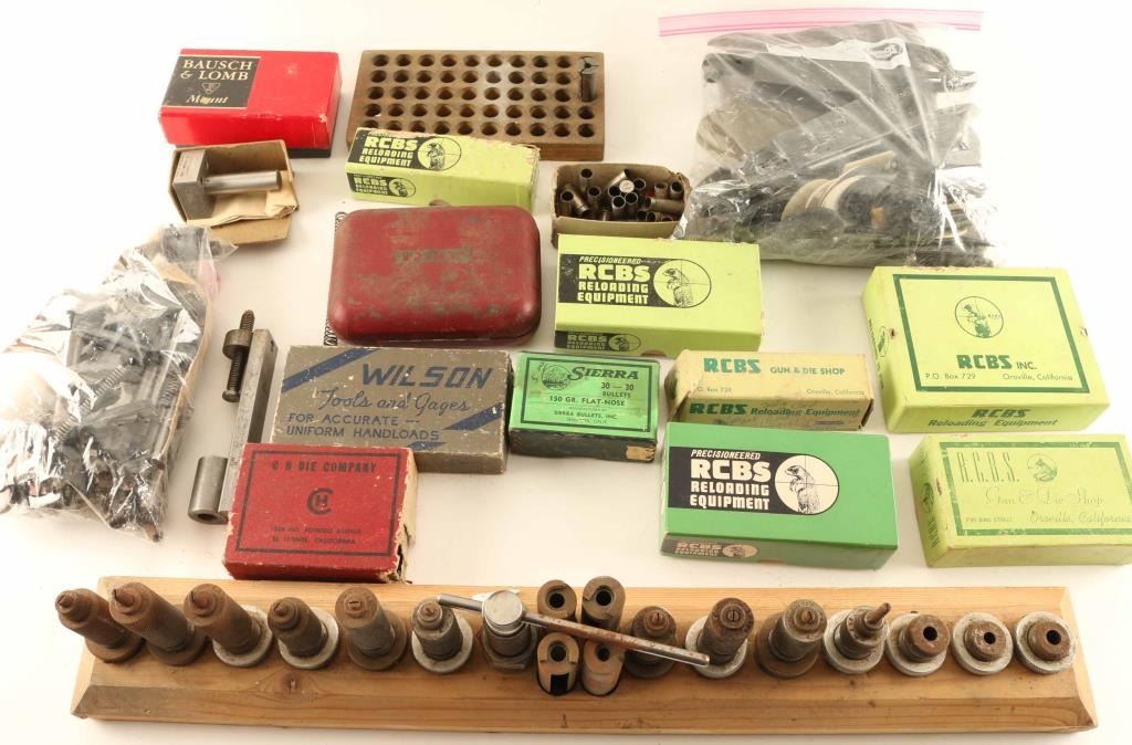Including (3) Stamped Trigger Guards for 1903A3 rifle, several die sets, powder scale, shell holders, and more.