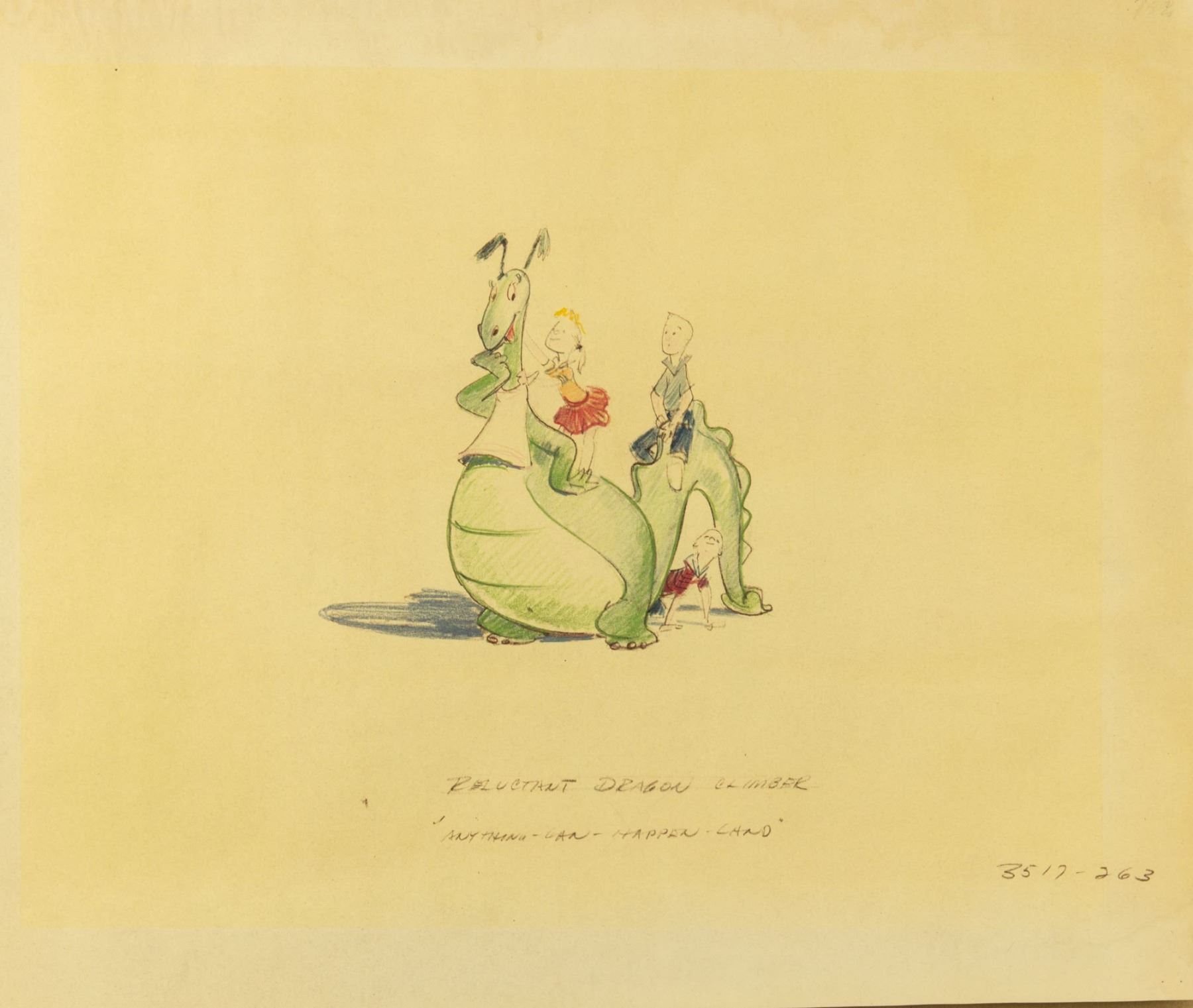 (Disneyland, c.1954) A hand-colored concept brownline by Imagineer Bruce Bushman. Titled "Reluctant Dragon Climber", this concept was created for Disneyland's unbuilt Anything-Can-Happen-Land. This brownline features Bushman's initials on the reverse and measures approximately 18.5"x23". The condition is good with minor wear and a thin strip of tape along the top-edge of the reverse.