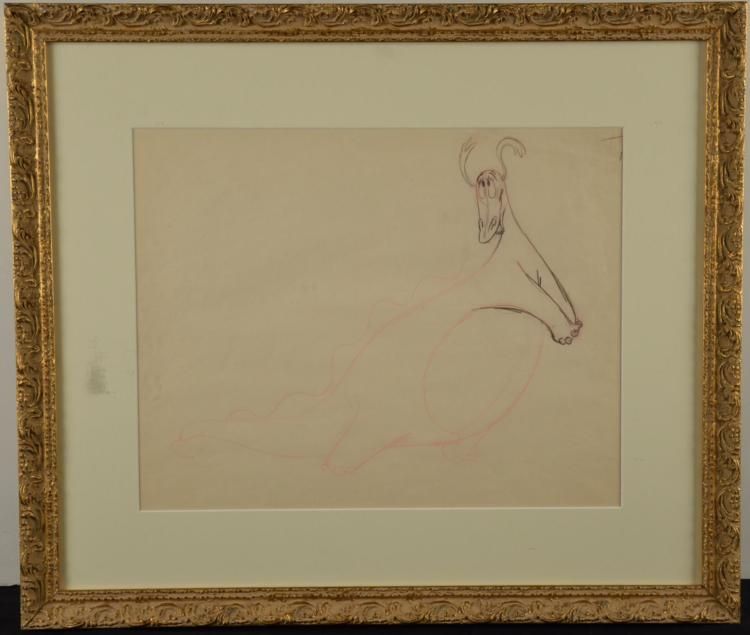 Here is an original drawing from the 1941 Disney movie The Reluctant Dragon. This movie combined animation with live action for a truly unique style. This drawing is unique too, showing a subtle outline of the body, with emphasis on the head and expression. * Medium: Black and red pencil on paperImage size: 11 x 14 inchesFraming: Matted in white, in gold painted decorative wood frame Frame size: 17 1/2 x 20 1/2 inchesCondition: Very good; some creasing upper right, normal to see on drawings like this; some sticker residue on the glass, can be cleaned offCertificate of Authenticity: Included