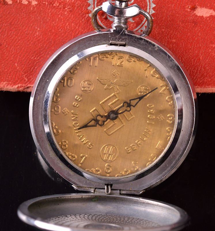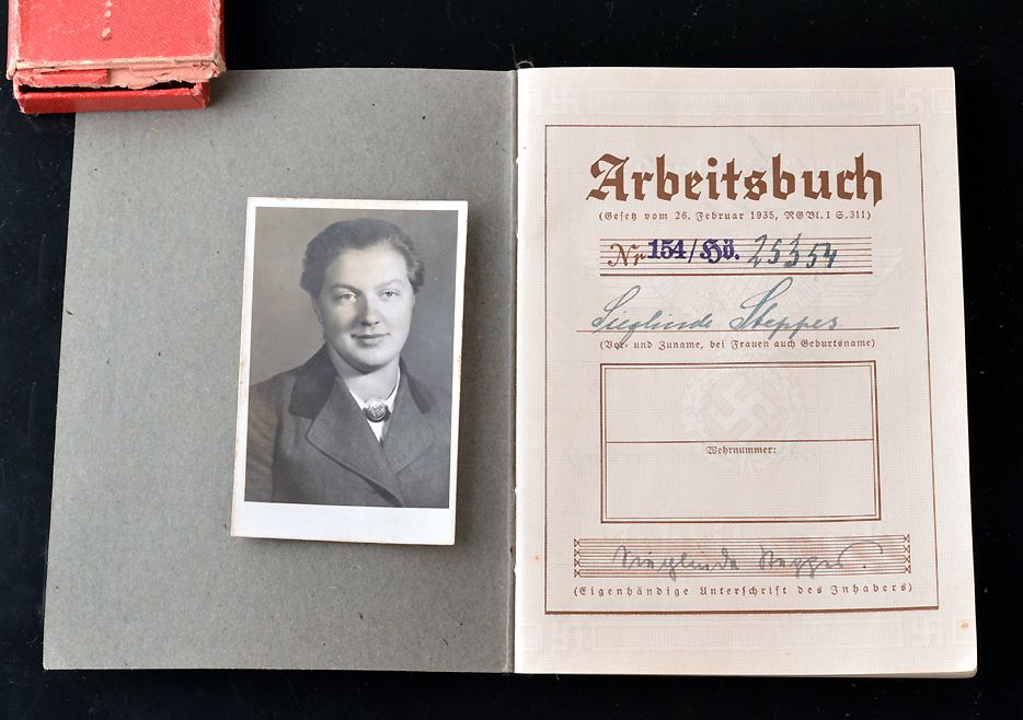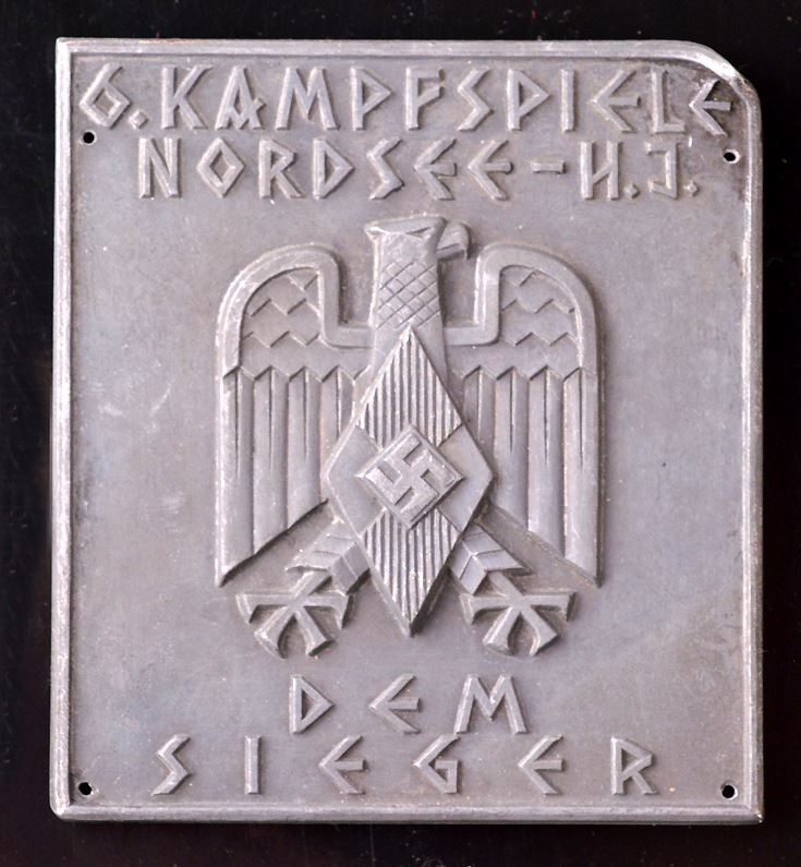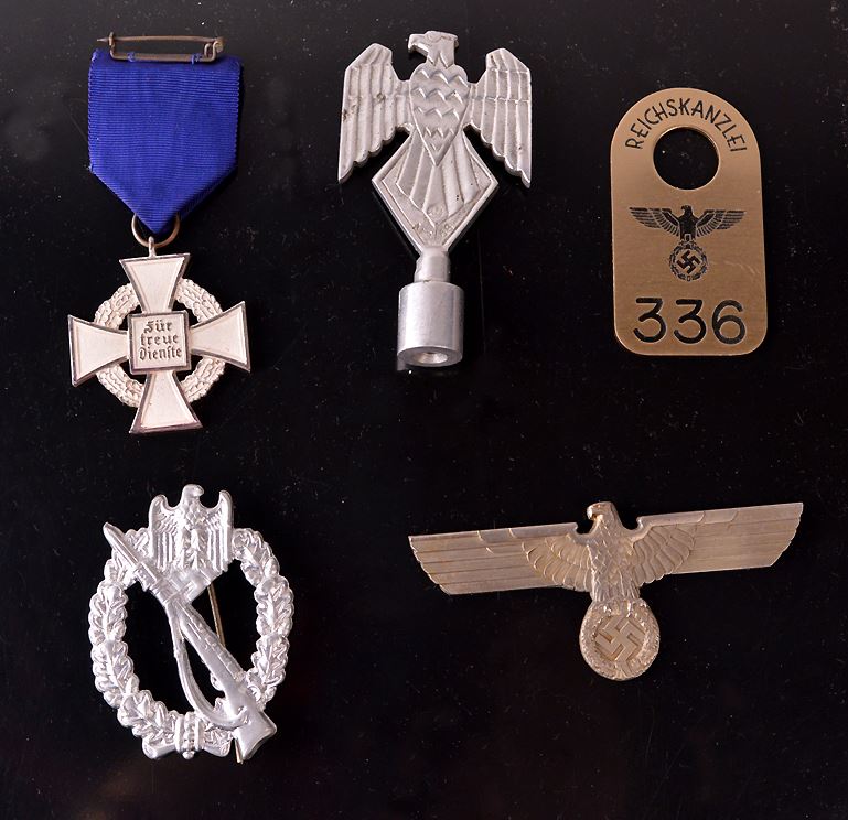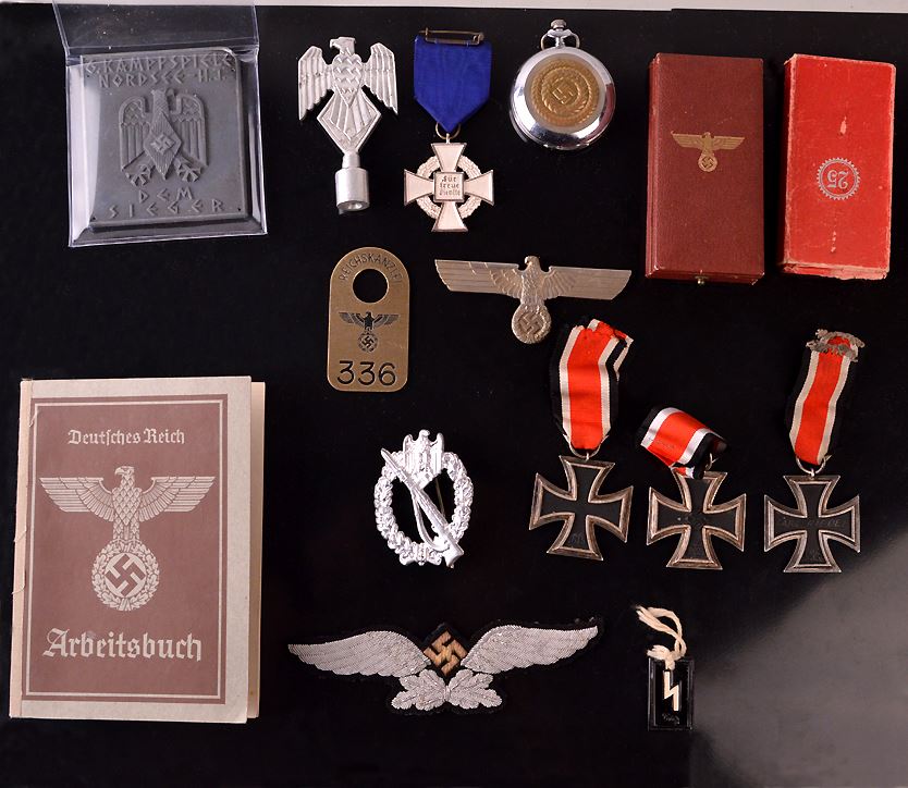 Germany, World War Two, Group: Iron Cross, 2nd class, with ring suspension, all with ribbons, (3), VF, one with name scratched on; Twenty Five Year medal, 2nd class, with ribbon and original box, medal EF, box Good; Infantry Badge, pin back, VF; cloth flying officer civil patch, silver and gold thread on black; plaque for a Hitler Youth camp in the North Sea area, dented corner, otherwise VF; threaded top for an ornamental stand or pole, F-VF, with manufacturers mark RZM and numbered M3/68; winged symbol of Third Reich, in metal, two rivet indents on back; empty case for Nazi medal; modern souvenir in the likeness of a World War Two pocket watch. No watch movement; German passbook for young woman, last date of entry 15th April, 1944, with a stamp from the Hitler Youth; Misc black and white plastic rectangular square, with white "S" and lead seal (detached); Reichstag claim tag, #336; total of 15 World War Two items.