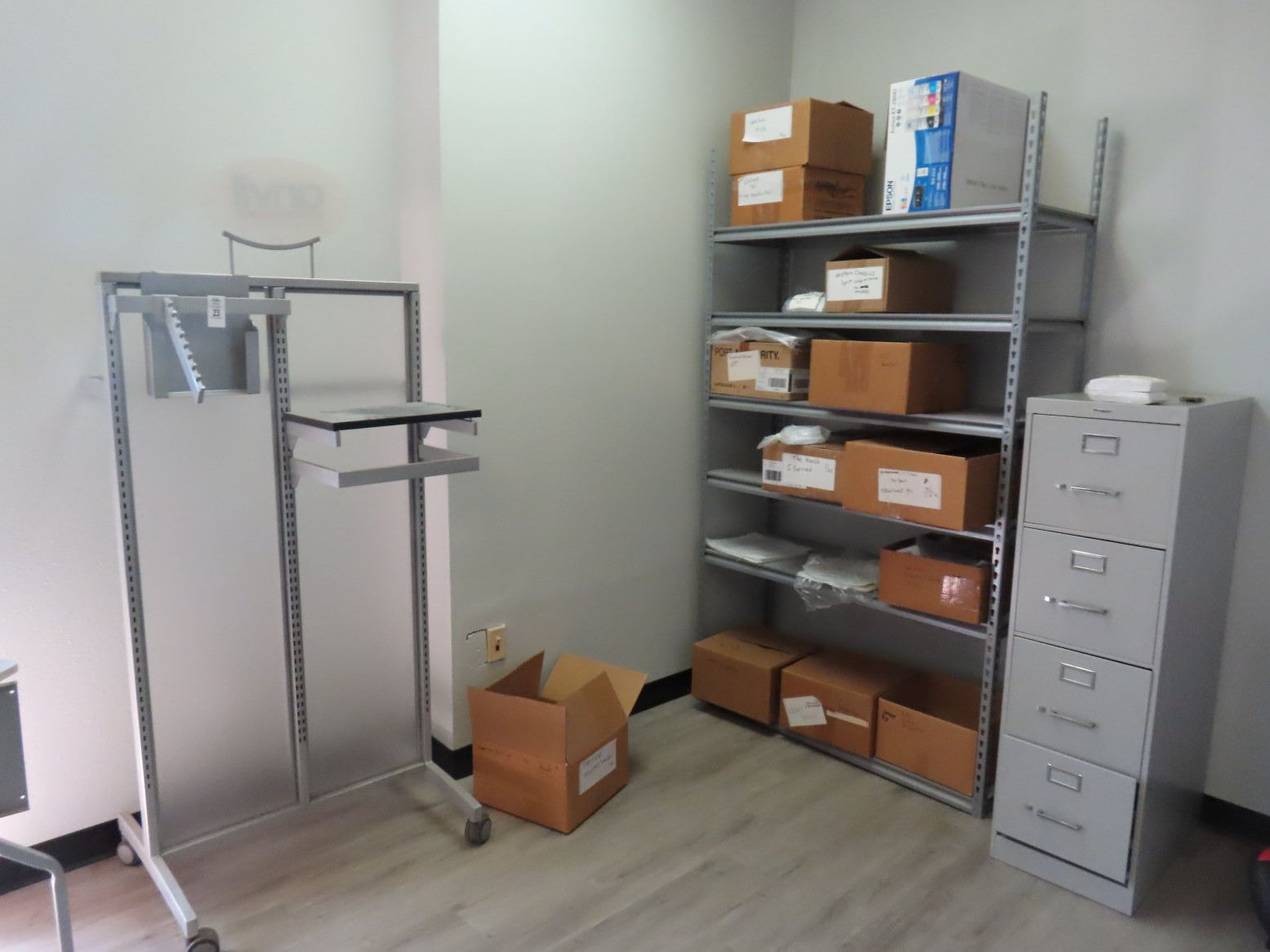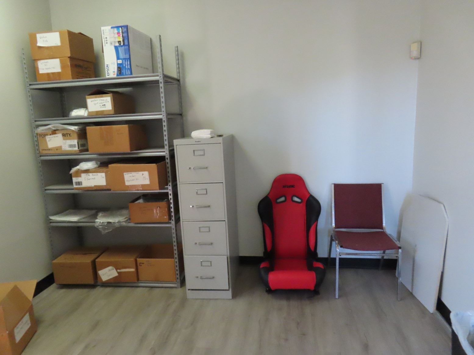 Remainder of Office w/Merchandising, Desk, Storage Racks, Computer Peripherals, Chairs