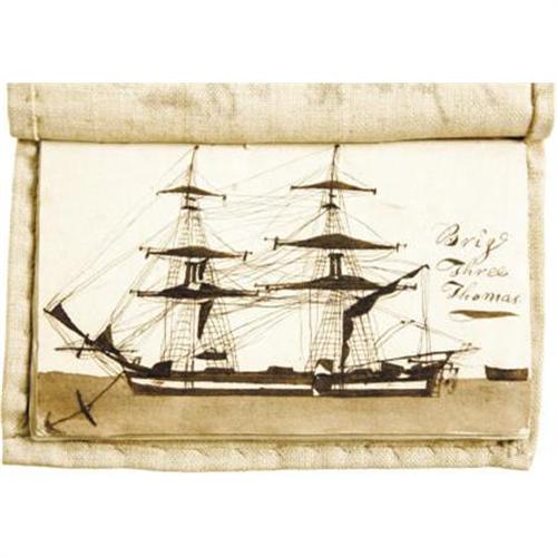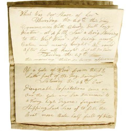 <B>Remarkable 1810 Seaman’s Journal With Detailed Account of His Rescue At Sea</B></I>. 6” x 3.75”, 60 pages, with entries from December 2, 1809 through December 25, 1810. This spectacular journal was written by John Fish, first mate serving on board the Brig <I>Three Thomas’s</B></I> whose homeport was Boston, Massachusetts. The <I>Three Thomas’s</B></I> was a 175 ton brig built in Kingston in 1805. The ship sailed from Boston bound for “<I>Tonigen</B></I>” with stops at “<I>Island of Hellegoland</B></I>” (Heligoland) and Norway. The <I>Three Thomas’s</B></I> set sail from London heading back to Boston on October 5, 1810. The crew’s ordeal began on the 9th of October, as Fish writes in part: “<I>…we perceived that our Brig leaked a little more than usual and that leak gradually Encreased sic until sic Monday the 15th by this time the leak had Encreased sic to the degree that she kept one pump going constantly…tried sic many experiments to find the leak but of no purpose…was every appearance of a gale of wind from the N. W…the gale commenced and the pump choked very bad by reason of our Ballast being washed fore and aft…we found that the leak had gained two feet more and at 2 AM found that there was about 6 feet of Water in the Whole sic …we then left our pumps to prepare our boats…most meloncholy sic to behold to see the lower Whole sic full of water…we left the Brig with about 40 lbs of bread and 16 gallons of water…at 6 AM the Brig lay with her lower yard arms in the water…Sunday the 22nd at 12 Meridian the Brig lay with her topsail yard in the water…at 3 PM the Brig disapeared sic …we let our yawl???? a stern and we steared sic to the South and East…</B></I>”. Thus begins a month long ordeal for the crew as they brave the inhospitable conditions of the North Sea and are passed by several potential rescuing ships that fail to see them. At a point near the height of his despair John Fish pens a verse in his journal: “<I>Adieu Dear Shipmates Whoom sic I love, O may I meet you In Worlds above, Our Darkness then Shall turn to Day, And Sin and Sorry flee away…Lines that Long Ocupied sic My Miynd sic </B></I>”. Fish seems to resign his self to his fate and prepares for the eventual end. But, on November 8, just when it seems all is lost Fish’s crew is picked up by the schooner <I>Friendship</B></I>. The <I>Friendship</B></I> safely deposits the crew at Liverpool where Fish apparently joins the crew of another ship named the <I>Poison</B></I> (or <I>Bison</B></I>?). The journal is a beautifully written testament of man whose brush with death caused profound changes in his life thereafter. Several pages recount dreams with religious overtones and he writes “<I>October 25th AD 1810 When first checked in my Wicked Career I soon found that I had too long traveled in that broad road which Leads to Hell…</B></I>”. John Fish is truly a man transformed by his difficult ordeal. Fish recounts one last strange tale while serving aboard the <I>Poison</B></I>, he writes in part: “<I>…at 6 PM the man that relieved the helm said I have sweetened my last tea. Whether he spoke to the man he had relieved or me I knew not but supposed that he meant the former. I asked what he meant - he said I have Drinkt sic my last tea - a Singular expression - though I don’t suppose he thought he should never drink any more tea…when the watch was called at 12 at knight sic this man was not on board the ship - I suppose he accidentally stept sic overboard.</B></I>” The handwriting is clear and sharp and Fish has drawn three rather good ink sketches of ships including one of the <I>Three Thomas’s</B></I>. The journal is bound in sail cloth with the inked title “<I>On Board the Ship Poison? Saco? Wrote In Liverpool</B></I>”. At the end of the journal and dated March 4, 1930, Fish’s grandson has written a brief biographical account of John Fish and how the journal was passed through the family. Included with the journal is a wealth of research documentation accumulated by the former owner. Useful documents include photocopies of the Three Thomas’s original registration papers, a photocopy of a <I>Lloyd’s List</B></I> for December 4, 1810 with a mention of the rescue of the crew of the <I>Three Thomas’s</B></I> by the <I>Friendship</B></I>, and many letters from various historical societies providing genealogical information. A wonderful and unique document worthy of further research. Fine.<BR><BR><BR><b>Shipping:</b> Books & Catalogs (<a target="_blank" href="http://www.heritageauctions.com/common/shipping.php">view shipping information</a>)