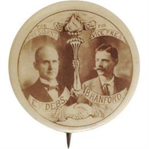 <B>Eugene V. Debs: A Remarkable 1904 Debs & Hanford Jugate Design</B></I> One of the most beautiful sepia button designs we have encountered, as well as one we have never encountered before. Campaign items for this five-time Socialist candidate for president are all scarce and highly prized. The appearance of a new jugate variety, especially such a beautiful one, will excite great interest. Condition is choice. Size: 7/8".<BR><BR><b>Shipping:</b> Miscellaneous Collectibles, Smal (<a target="_blank" href="http://www.heritageauctions.com/common/shipping.php">view shipping information</a>)