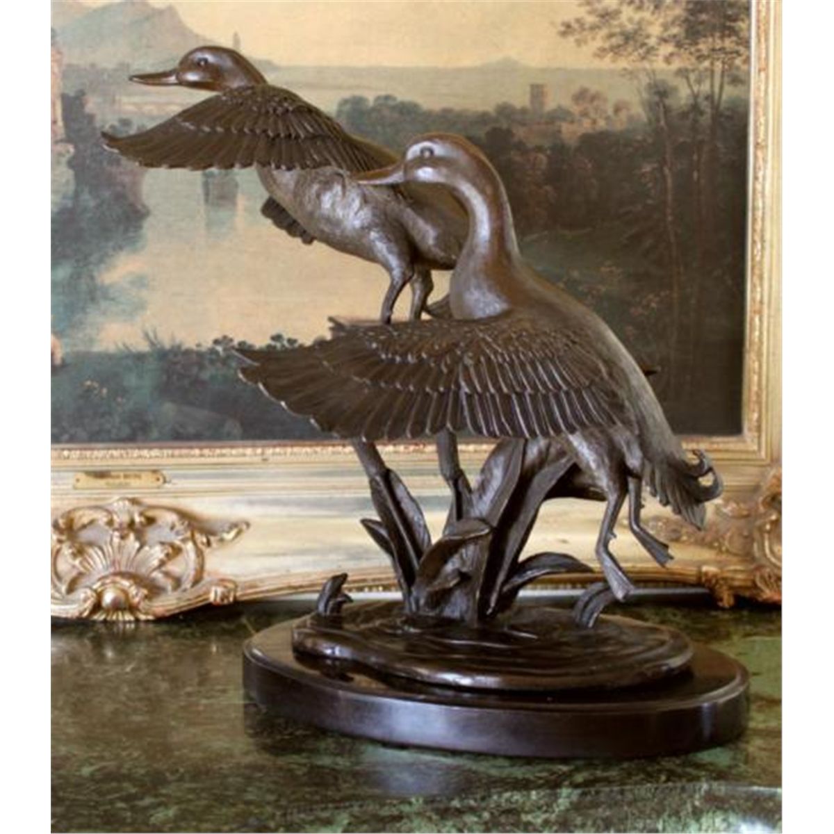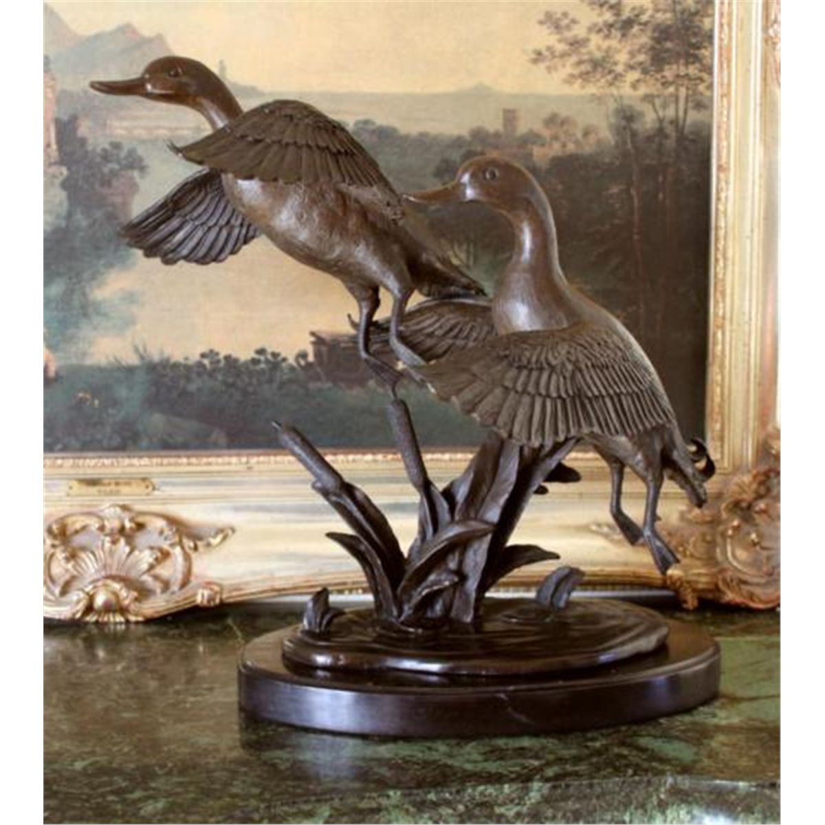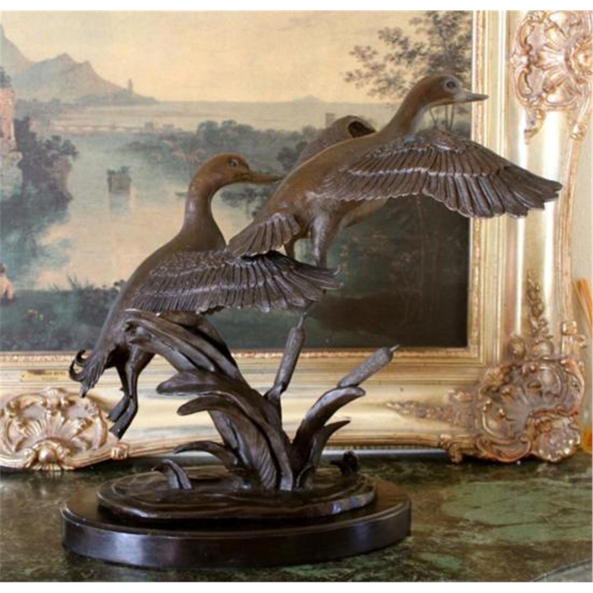 Two Flying Ducks, Bronze Sculpture, After Barye 16inH x 15inL x 8inD 35 lbs. This bronze sculpture was produced using the Lost Wax casting method. The Lost Wax Cast method is the most precise metal casting technique in existence, ensuring exquisite detail of the original host model which is usually sculpted in clay or wax. This Lost Wax casting method is an extremely labor intensive and expensive process, but the end results produce a Heirloom Quality Masterpiece!