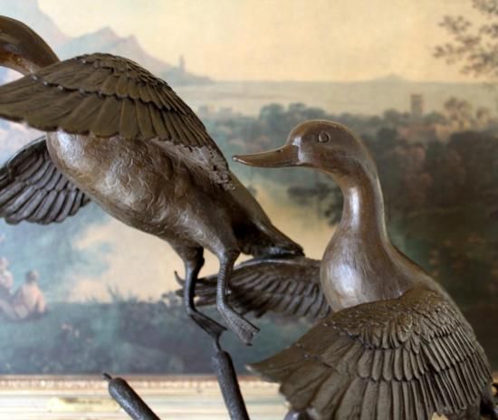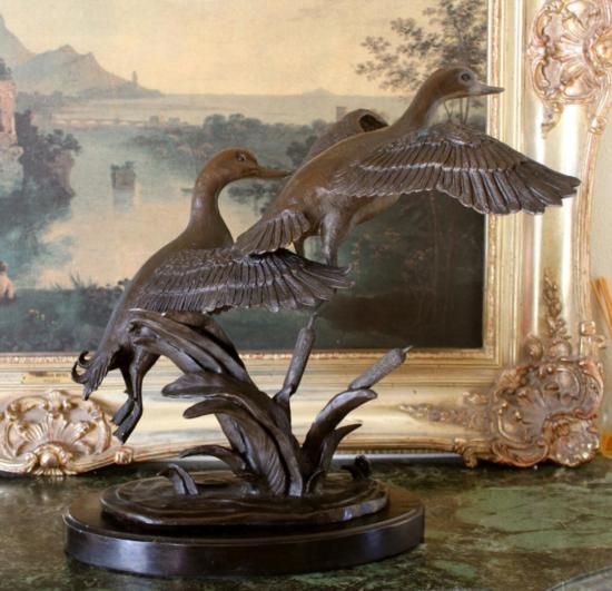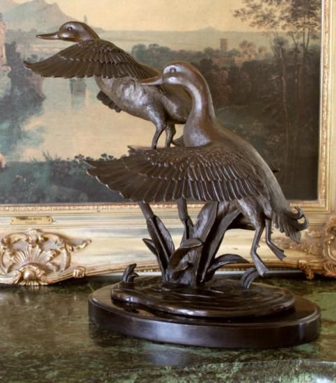 Two Flying Ducks, Bronze Sculpture, After Barye 16inH x 15inL x 8inD 35 lbs. This bronze sculpture was produced using the Lost Wax casting method. The Lost Wax Cast method is the most precise metal casting technique in existence, ensuring exquisite detail of the original host model which is usually sculpted in clay or wax. This Lost Wax casting method is an extremely labor intensive and expensive process, but the end results produce a Heirloom Quality Masterpiece!
