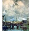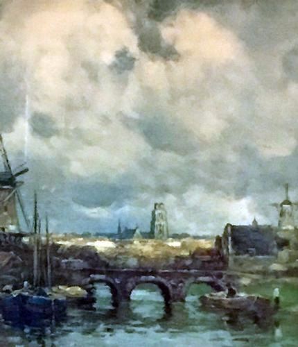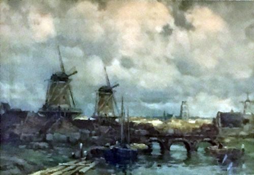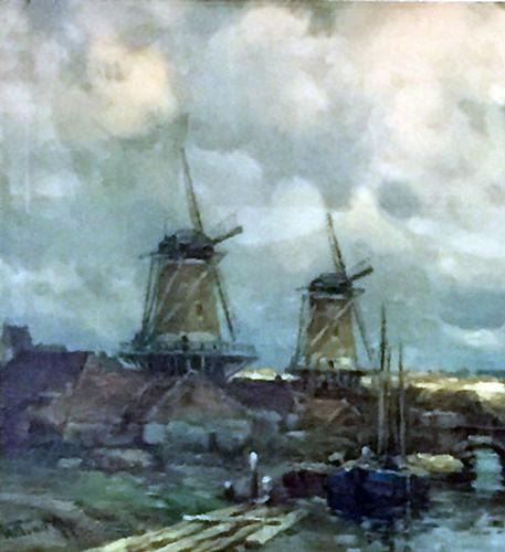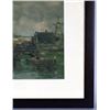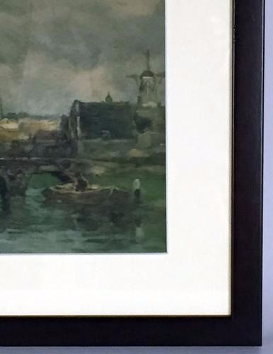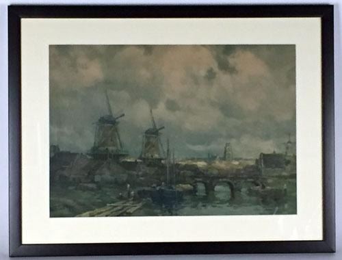 Remarkable Enticing View of Windmills Fishing Boats. Attractively matted and framed print. Magical brooding print in blue-green tones depicts 3 windmills under rolling clouds on a flat dutch landscape with fishermen laboring and boats in the foreground. Quite captivating. Appears to be signed Willem at lower left. Handsome matting and frame strike exactly the right note. Size: 26X20 inches. Country of origin: France.