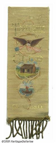 <B>Remarkable Hand-painted Benjamin Harrison Ribbon</B></I> We have never seen this elegant design before. Like many items used to promote the 1888 Republican candidate, it features a log cabin and "Tippecanoe Club" to remind the voters of his famous grandfather, William Henry Harrison. Also pictured is an Indian, presumably to conjure up the image of William Henry Harrison as the vanquisher of Tecumseh. One of the prettiest ribbon designs we have seen. Excellent condition, with a hint of even, light "aging." Length 7 3/4". Lot:260
