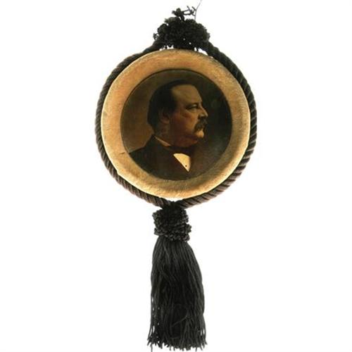 <B>Remarkable Huge Grover Cleveland Display Piece.</B></I> It is hard to say whether this was intended as a wearing badge or for wall hanging, as it could well have been employed either way. 3.25" portrait of Cleveland is a decal fused to the underside of the convex glass. Choice condition but for a couple of trivial bubbles in the adherence of the decal, as made. A beautiful display item we have not encountered before. Overall size, 5" x 10.5".