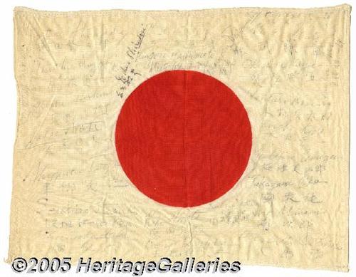 <B>Remarkable Japanese Flag Autographed by Twenty-four Accused World War II Criminals Including Prime Minister Tojo</B></I> This 13" x 10.5" cloth flag was signed by all 24 major Japanese World War II criminals who were confined at Sugamo military prison, including seven who were sentenced to death by hanging. Each has signed his name both in Japanese characters and in western form. Most prominent was General Hideki Tojo, who headed the government and also served as Chief of the Army General Staff. Also signing, among others, were Baron Koki Hirota (former Foreign Minister and Prime Minister 1936-37), General Heitaro Kimura (commander of the notorious Japanese forces in Burma), and Admiral Shigetaro Shimada, who was Navy Minister at the time of Pearl Harbor. (A comprehensive listing of the signers, with brief biographies, accompanies this lot.) The prominent Japanese prisoners were noted for their extreme politeness and generally cooperative attitudes, in sharp contrast to the accused German war criminals. The provenance of this historic piece could not be more impeccable: it is consigned by the gentleman who was the chief jailer at the prison, and is accompanied by a letter from him describing the circumstances under which he personally obtained the signatures. Also included are an official identification photo of him from the prison and a snapshot he took of Tojo behind prison bars. Condition of this flag is very nice, with moderate but even fading of the ink in the signatures; every letter and character is clearly legible. Very slight hint of age browning of the cloth itself is noted for accuracy. Under glass in an old, probably original faux bamboo wood frame, measuring 17" x 14". A very special item. PSA/DNA lacks sufficient comparable examples to render an opinion on this item. While we believe it to be authentic as described, it is thus sold without certification. <I>Accompanied by COA from PSA/DNA.</B></I>