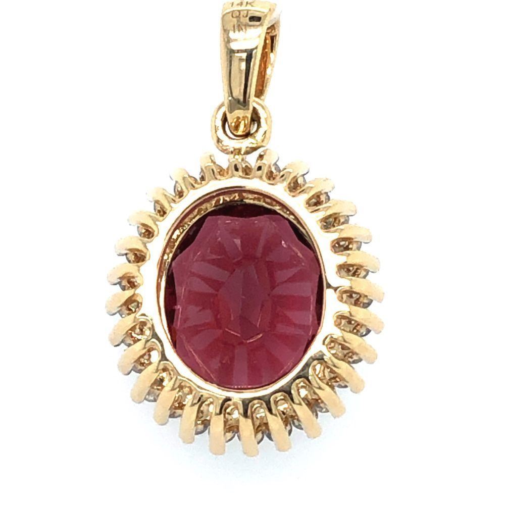 ADDITIONAL INFORMATION:& nbsp; The rhodolite garnet is a favorite of the numerous varieties with its incredible wine-colored hue! This yellow gold ring is oval-cut, cranberry red colored rhodolite garnet and is prong-set with diamonds in the halos. The smooth, polished shoulders of the ring are raised with a slight cathedral look. This ring also has a ribbed open gallery. CHECK OUT THE MATCHING PENDANT AND ERRINGS IN LOTS 21 & amp; 25