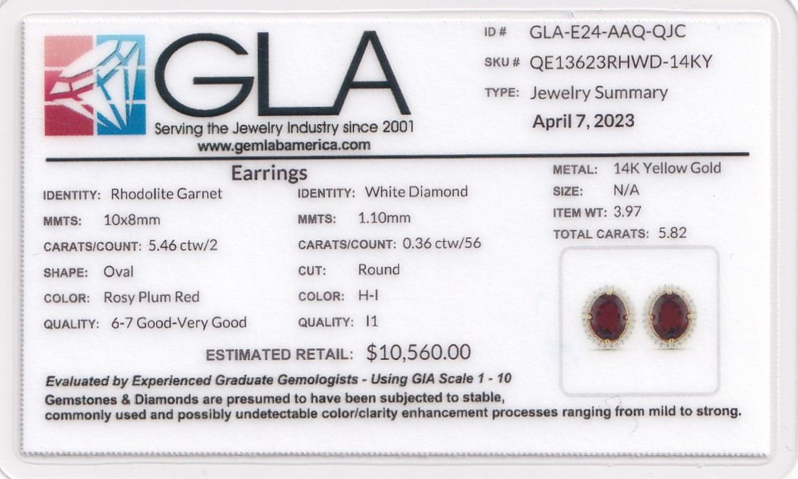 Genuine Garnet and Earth-Mined Diamond Earrings. Remarkably stunning color.& nbsp; These 14 karat yellow gold earrings feature 5.46 total carats of oval-cut, prong-set rhodolite garnets with a total of .36 carats round, brilliant-cut, H-I color, I1 clarity diamonds in the halos. The earrings are approximately 1/2& quot; diameter and attach to the earlobe with posts and friction backs. These earrings are certified and appraised for $10,560.00 estimated retail replacement value. CHECK OUT THE MATCHING RING AND PENDANT IN LOTS 58 AND 59!