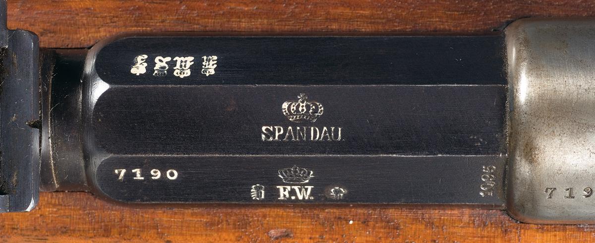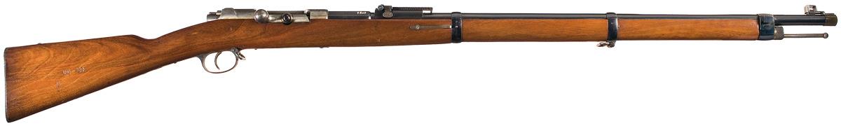 Blade and folding ladder sights, with the barrel marked "crown/ F.W." on the upper left flat, "I.G. Mod. 71/84." and "1887." on the receiver and "crown/ gothic letter" proofs on both. Matching numbers overall. Smooth straight grip stock, with a series of "crown/ gothic letter" proofs and a flat buttplate marked "K.A.R./ E.3.153." on the heel.