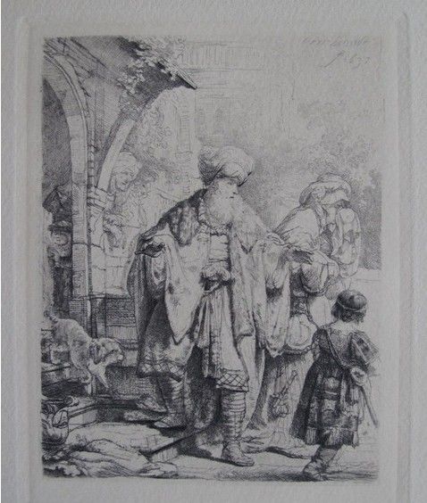 This is a beautiful etching, after Rembrandt, by master engraver Amand Durand. Titled "Abraham Casting Out Hagar and Ishmael" (year of original 1637). Signed in the plate. Measurements: image size is 5" x 4" on 11" x 10" Somerset paper. Comes with a certificate of authenticity. Ref. #30 according to the British Catalogue, circa 1797, is a hand pulled-ETCHING from the AUTHENTIC & Original copper Rembrandt plates by Armand-Durand (1831-1905) overseen by Art World Industries, inc. This piece is in excellent condition, and has never been framed.