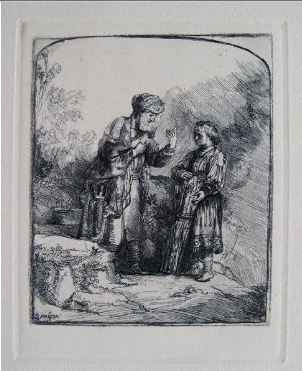 This is a beautiful etching, after Rembrandt, by master engraver Amand Durand. Titled "ABRAHAM AND ISAAC" (year of original 1645). Measurements: image size is 6.5" x 6" on 14" x 11" Somerset paper. This piece is signed and dated in the plate. Comes with a certificate of authenticity. Ref. #34 according to the British Catalogue, circa 1797, is a hand pulled-ETCHING from the AUTHENTIC & Original copper Rembrandt plates by Armand-Durand (1831-1905) overseen by Art World Industries, inc. This piece is in excellent condition, and has never been framed.