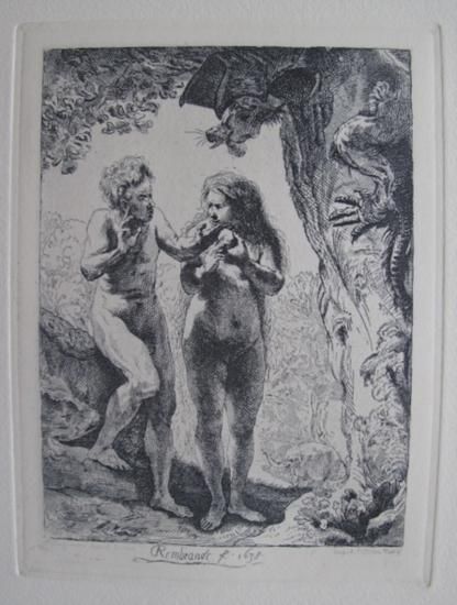 This is a beautiful etching, after Rembrandt, by master engraver Amand Durand. Titled "ADAM AND EVE" (year of original 1638). This piece is in excellent condition, and has never been framed. Measurements: image size is 7 x 5" on 14" x 10" Somerset paper. Comes with a certificate of authenticity. Ref. #28 according to the British Catalogue, circa 1797, is a hand pulled-ETCHING from the AUTHENTIC & Original copper Rembrandt plates by Armand-Durand (1831-1905) overseen by Art World Industries, inc. Amand Durand blindstamp SEAL on lower right. Rembrandt was born in 1606 in Leiden, Holland . Before his 30th birthday, the name Rembrandt had become synonymous with artistic excellence. The Dutch master was known worldwide for his highly prized series of classical etchings. These images are known for their delicacy of tone and intricacy of detail. To raise funds in 1657, Rembrandt sold the plates at an auction of his entire estate to a prestigious European family with the expressed stipulation that not even one of the etchings could be printed until a full 100 years had passed after his death. The family faithfully honored the binding agreement. Owing to their great popularity and soft metallurgical consistency, the original plates became worn by the mid 1800's. To save these genius-inspired works, Amand Durand, a master engraver, born in France in 1831, spent the major part of his career exactly duplicating the genius of Rembrandt onto hard, lasting copper plates. Art historians and critics have been stunned by the incredible quality Durand achieved through his own technical genius. Historical references indicate that Armand Durand's amazing skills were well known to expert of the 19th and early 20th centuries. Many esteemed art critics and curators feel that Durand's works not only do great justice to Rembrandt's original concepts but subtly improve on the legendary Dutch master in a technical sense. The copper plate was reworked by Amand Durand in the late 1800s and this piece was made from that plate. It is beautiful.