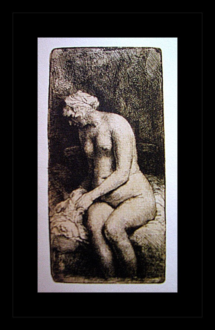 Erotic sketch lithograph by Rembrandt. Comes gallery framed black on black.