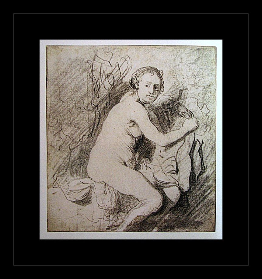 Erotic sketch lithograph by Rembrandt. Comes gallery framed black on black.
