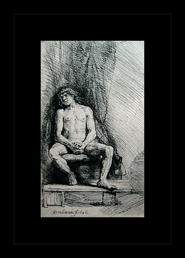 Erotic sketch lithograph by Rembrandt. Comes gallery framed black on black.