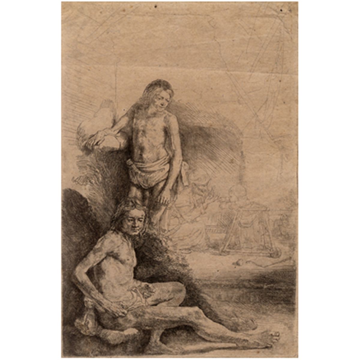 Rembrandt, Nude Man Seated and Another Standing with a Woman and a Baby